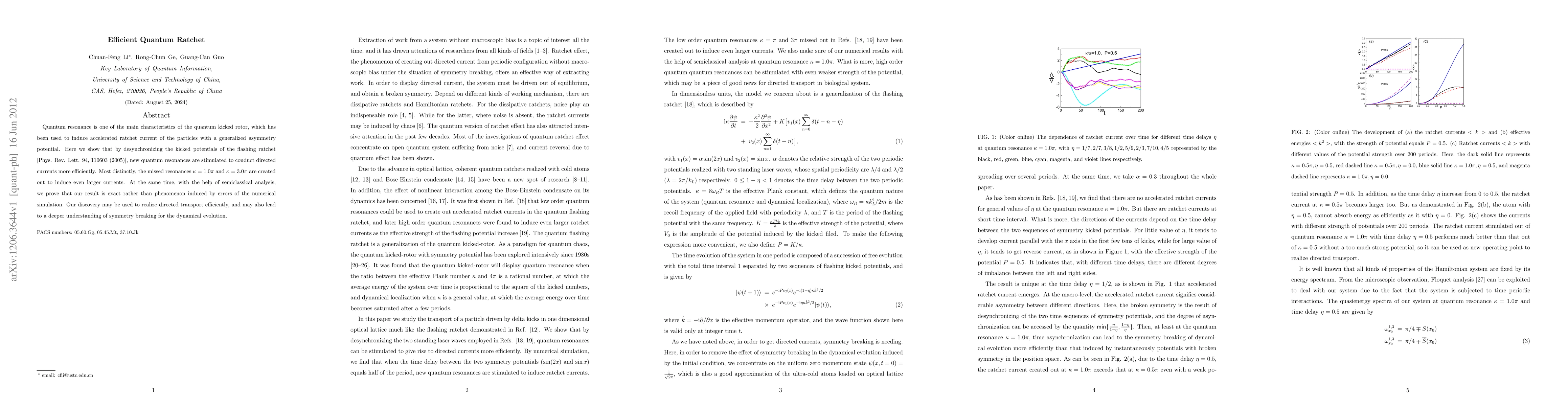 The paper presents a novel method to stimulate quantum resonances for efficient directed currents through desynchronization of kicked potentials in a flashing ratchet system.