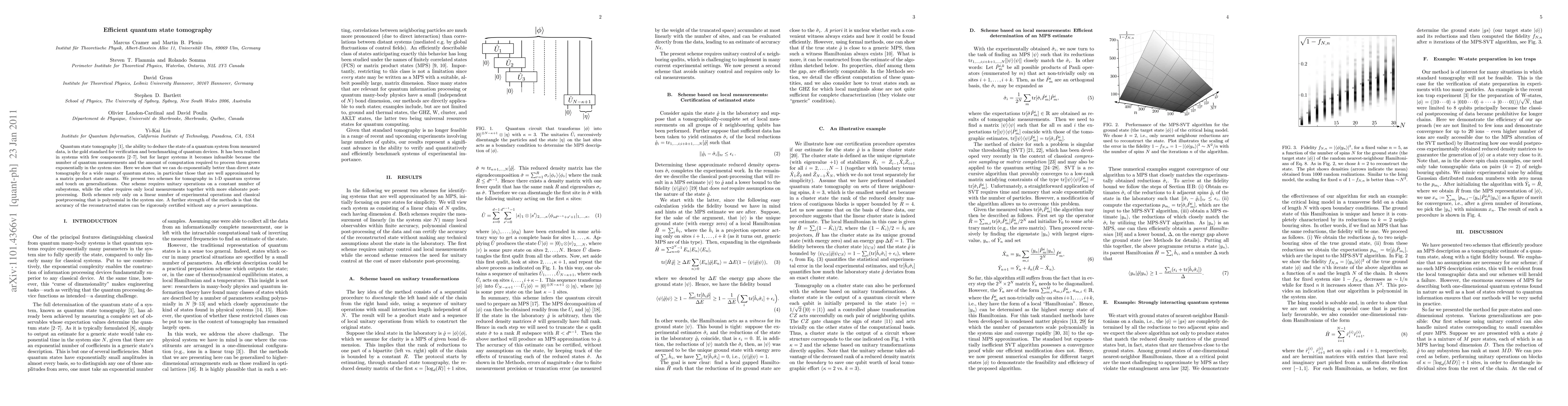 Quantum state tomography, the ability to deduce the state of a quantum system from measured data, is the gold standard for verification and benchmarking of quantum devices. It has been realized in systems with few components, but for larger systems it becomes infeasible because the number of quantum measurements and the amount of computation required to process them grows exponentially in the system size. Here we show that we can do exponentially better than direct state tomography for a wide range of quantum states, in particular those that are well approximated by a matrix product state ansatz. We present two schemes for tomography in 1-D quantum systems and touch on generalizations. One scheme requires unitary operations on a constant number of subsystems, while the other requires only local measurements together with more elaborate post-processing. Both schemes rely only on a linear number of experimental operations and classical postprocessing that is polynomial in the system size. A further strength of the methods is that the accuracy of the reconstructed states can be rigorously certified without any a priori assumptions.