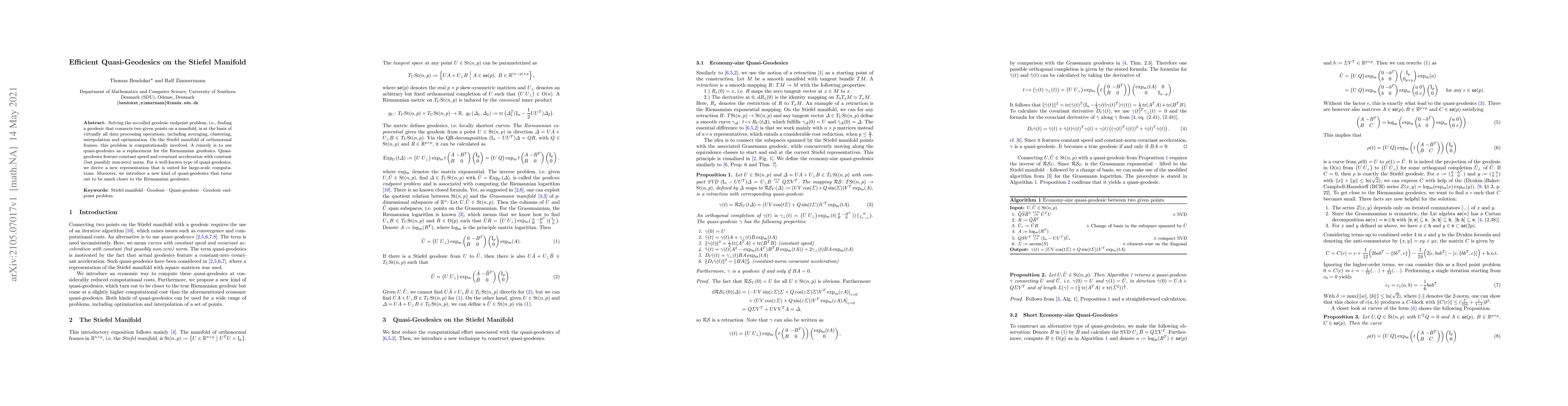 Solving the so-called geodesic endpoint problem, i.e., finding a geodesic that connects two given points on a manifold, is at the basis of virtually all data processing operations, including averaging, clustering, interpolation and optimization. On the Stiefel manifold of orthonormal frames, this problem is computationally involved. A remedy is to use quasi-geodesics as a replacement for the Riemannian geodesics. Quasi-geodesics feature constant speed and covariant acceleration with constant (but possibly non-zero) norm. For a well-known type of quasi-geodesics, we derive a new representation that is suited for large-scale computations. Moreover, we introduce a new kind of quasi-geodesics that turns out to be much closer to the Riemannian geodesics.