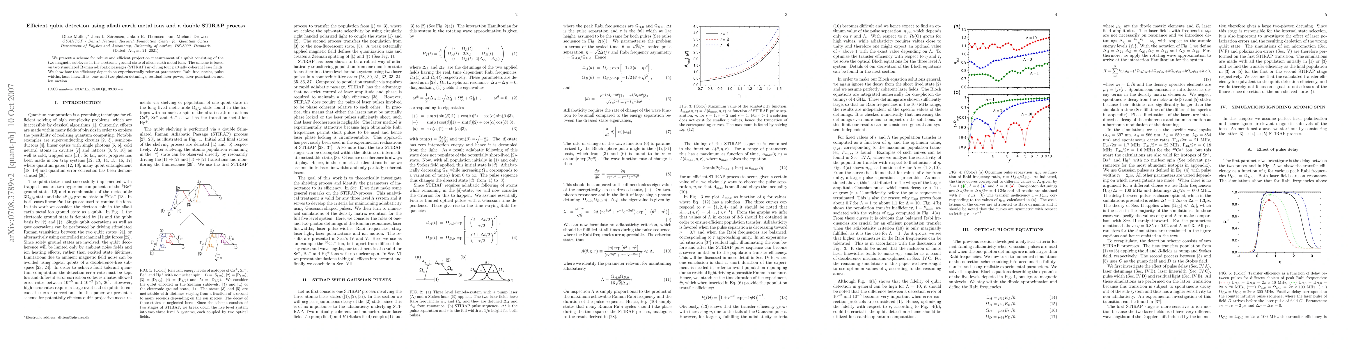We present a scheme for robust and efficient projection measurement of a qubit consisting of the two magnetic sublevels in the electronic ground state of alkali earth metal ions. The scheme is based on two stimulated Raman adiabatic passages (STIRAP) involving four partially coherent laser fields. We show how the efficiency depends on experimentally relevant parameters: Rabi frequencies, pulse widths, laser linewidths, one- and two-photon detunings, residual laser power, laser polarization and ion motion.