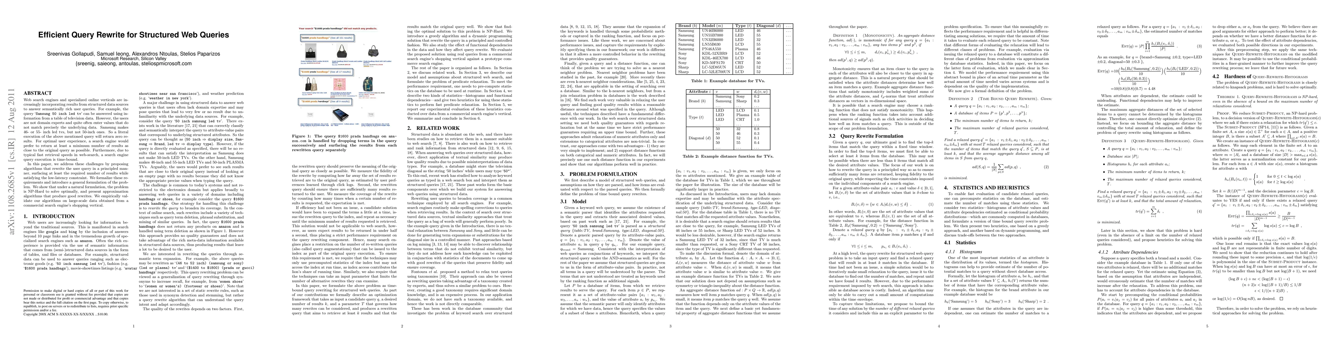 This paper proposes algorithms for efficiently rewriting structured web queries to retrieve relevant results despite mismatches between user input and underlying data. It addresses the challenge of returning results within time constraints while maintaining query relevance, presenting approximation algorithms validated on commercial search engine data.