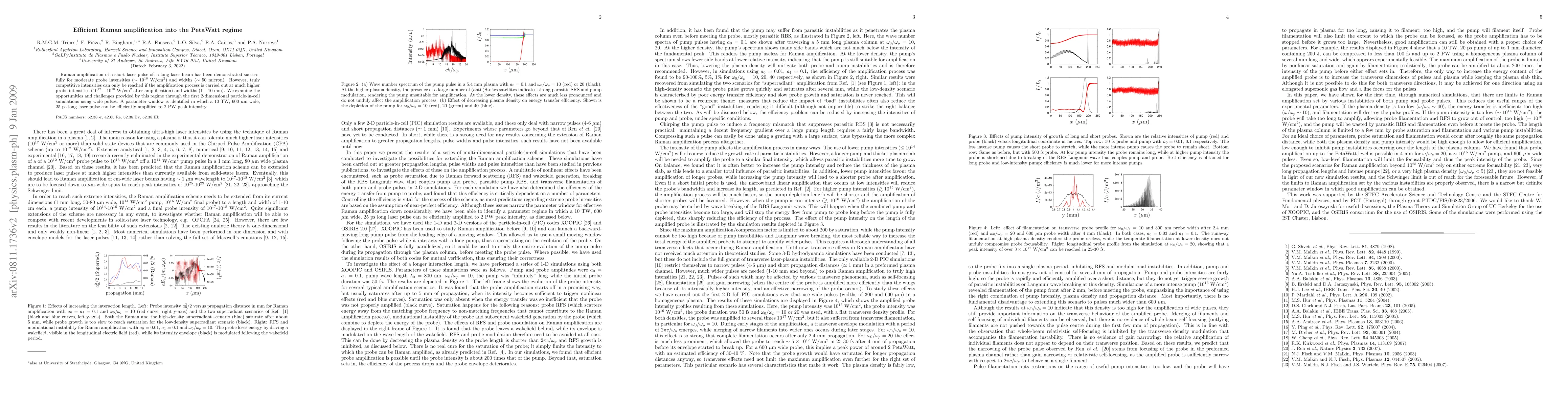 This paper demonstrates the feasibility of Raman amplification for achieving PetaWatt peak intensities by simulating the process at high probe intensities and widths. It identifies a parameter window allowing a 10 TW, 600 µm wide pulse to be amplified to 2 PW, highlighting both opportunities and challenges in this regime.
