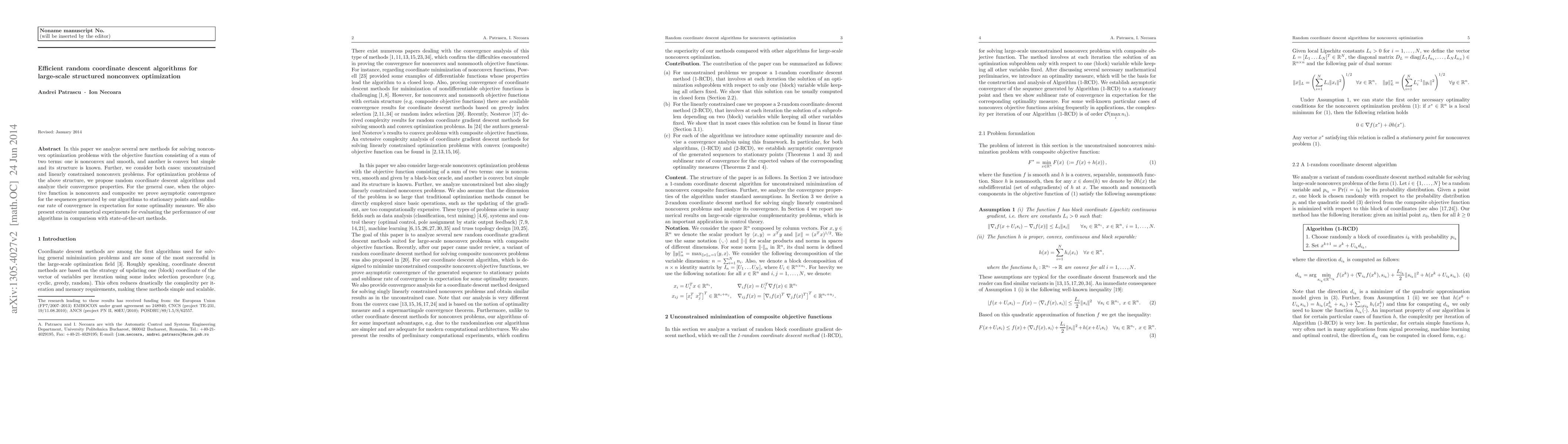 This paper proposes and analyzes efficient random coordinate descent algorithms for solving large-scale structured nonconvex optimization problems. It demonstrates asymptotic convergence to stationary points and sublinear convergence rates, with local linear convergence under certain conditions, supported by extensive numerical comparisons.