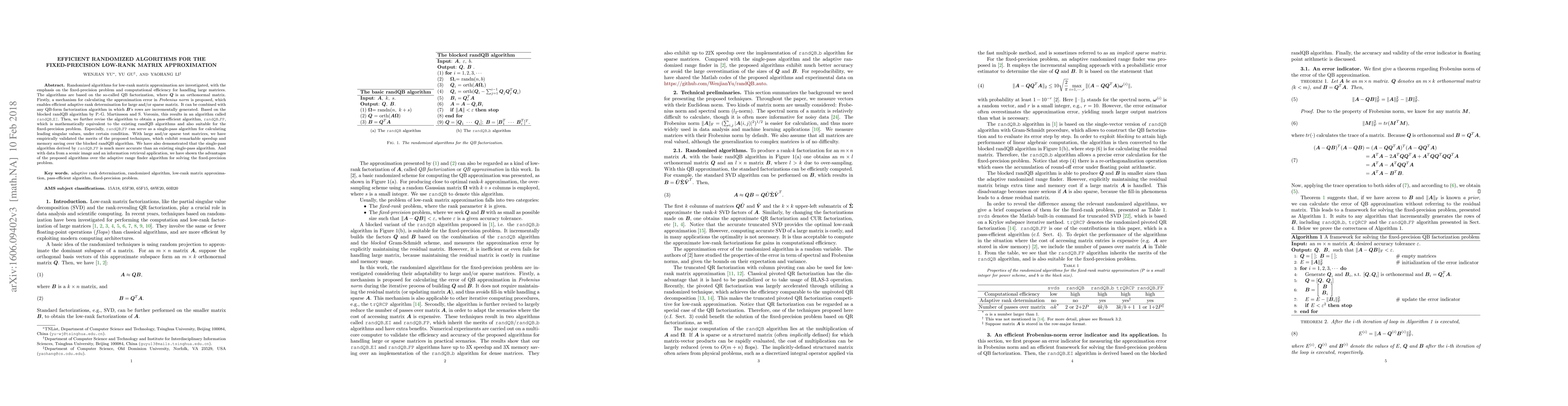 Randomized algorithms for low-rank matrix approximation are investigated, with the emphasis on the fixed-precision problem and computational efficiency for handling large matrices. The algorithms are based on the so-called QB factorization, where Q is an orthonormal matrix. Firstly, a mechanism for calculating the approximation error in Frobenius norm is proposed, which enables efficient adaptive rank determination for large and/or sparse matrix. It can be combined with any QB-form factorization algorithm in which B's rows are incrementally generated. Based on the blocked randQB algorithm by P.-G. Martinsson and S. Voronin, this results in an algorithm called randQB EI. Then, we further revise the algorithm to obtain a pass-efficient algorithm, randQB FP, which is mathematically equivalent to the existing randQB algorithms and also suitable for the fixed-precision problem. Especially, randQB FP can serve as a single-pass algorithm for calculating leading singular values, under certain condition. With large and/or sparse test matrices, we have empirically validated the merits of the proposed techniques, which exhibit remarkable speedup and memory saving over the blocked randQB algorithm. We have also demonstrated that the single-pass algorithm derived by randQB FP is much more accurate than an existing single-pass algorithm. And with data from a scenic image and an information retrieval application, we have shown the advantages of the proposed algorithms over the adaptive range finder algorithm for solving the fixed-precision problem.
