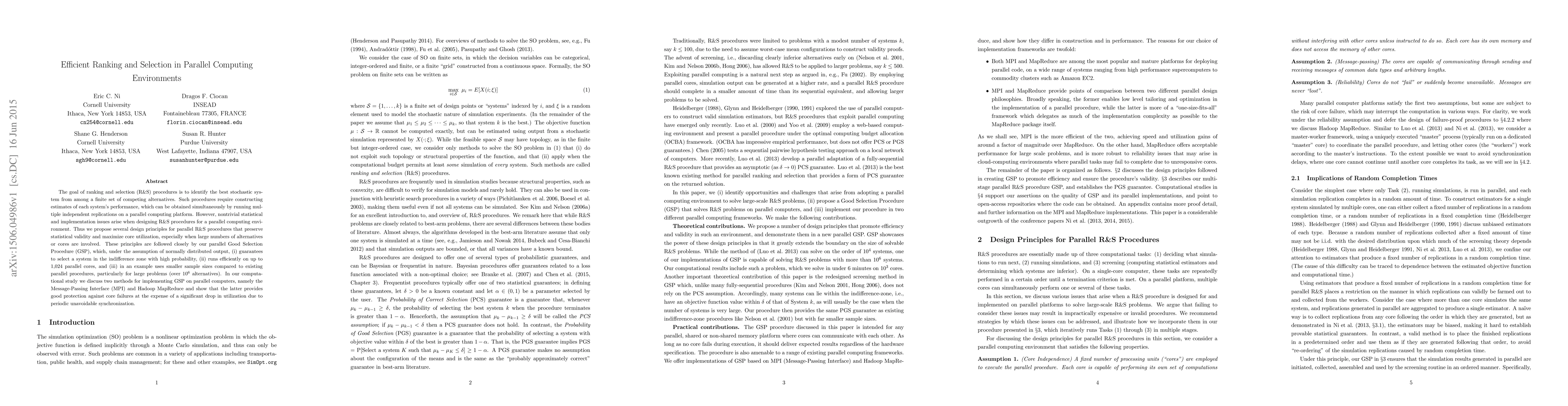 This paper proposes design principles for efficient ranking and selection procedures in parallel computing environments, introducing the parallel Good Selection Procedure (GSP) that guarantees optimal selection with high probability and efficient use of up to 1,024 cores, while requiring smaller sample sizes for large-scale problems. The study also compares GSP implementations using MPI and Hadoop MapReduce, highlighting the trade-off between fault tolerance and core utilization.