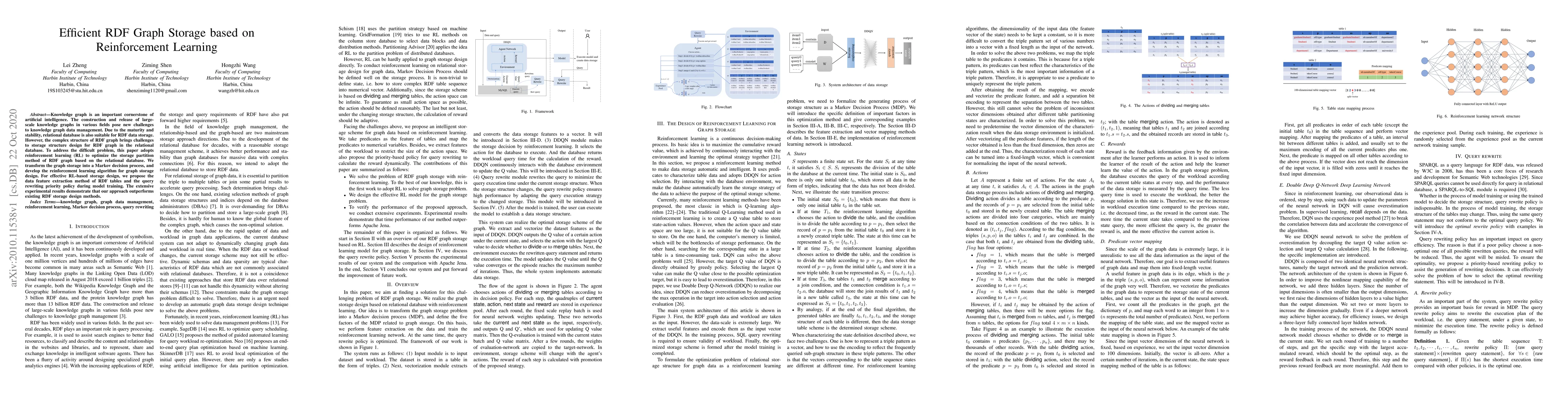 This paper proposes a reinforcement learning approach to optimize the storage of RDF graphs in relational databases by transforming the problem into a Markov decision process, utilizing data feature extraction and query rewriting strategies, and achieving superior performance compared to existing methods.