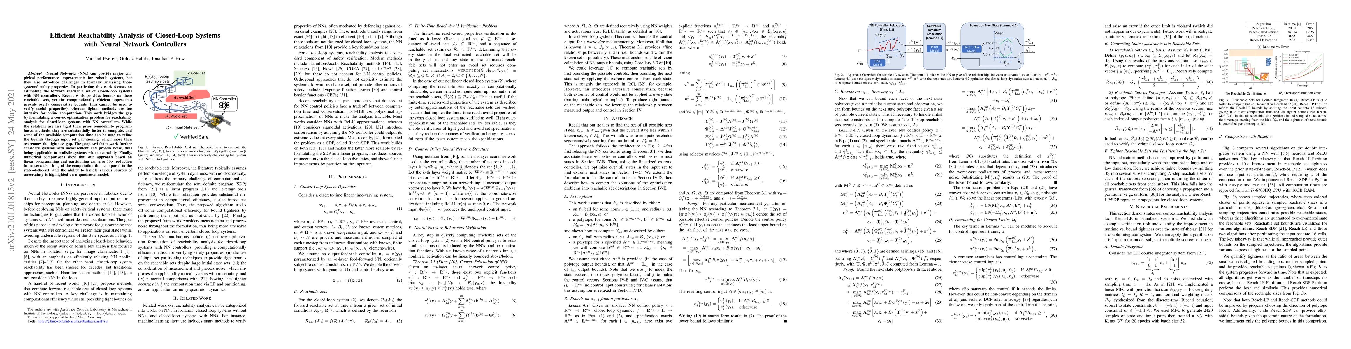 This paper proposes a convex optimization approach for efficient reachability analysis of closed-loop robotic systems controlled by neural networks, achieving a balance between computational efficiency and analysis tightness through input set partitioning. The method is shown to reduce conservatism by tenfold in half the time compared to state-of-the-art methods, while handling measurement and process noise.