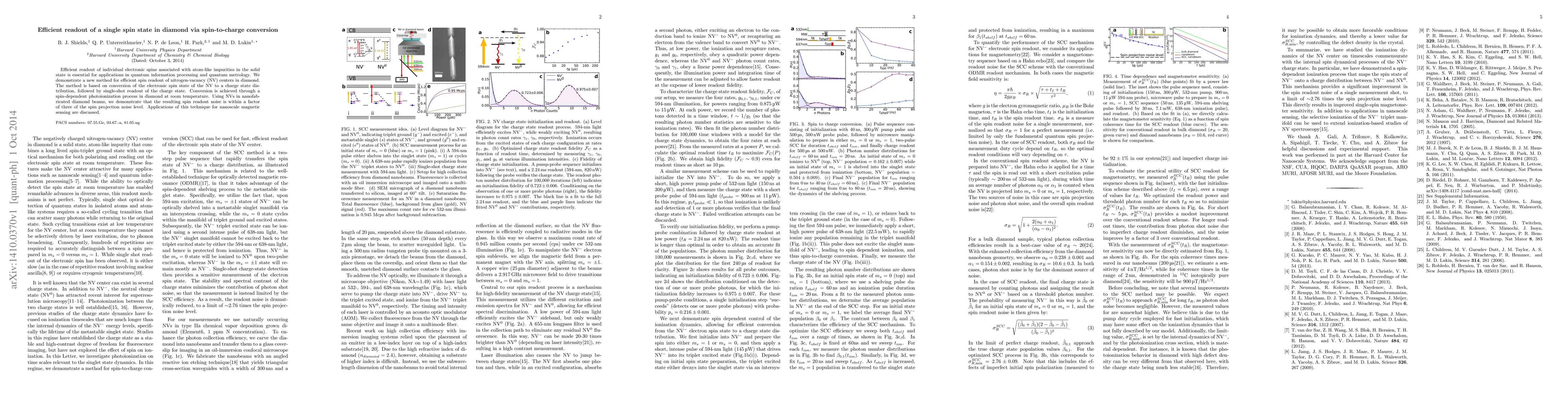 This paper presents a new method for efficient readout of nitrogen-vacancy (NV) centers in diamond by converting spin states to charge states via spin-dependent photoionization, achieving readout noise close to the spin projection noise level. The technique holds potential for nanoscale magnetic sensing applications.