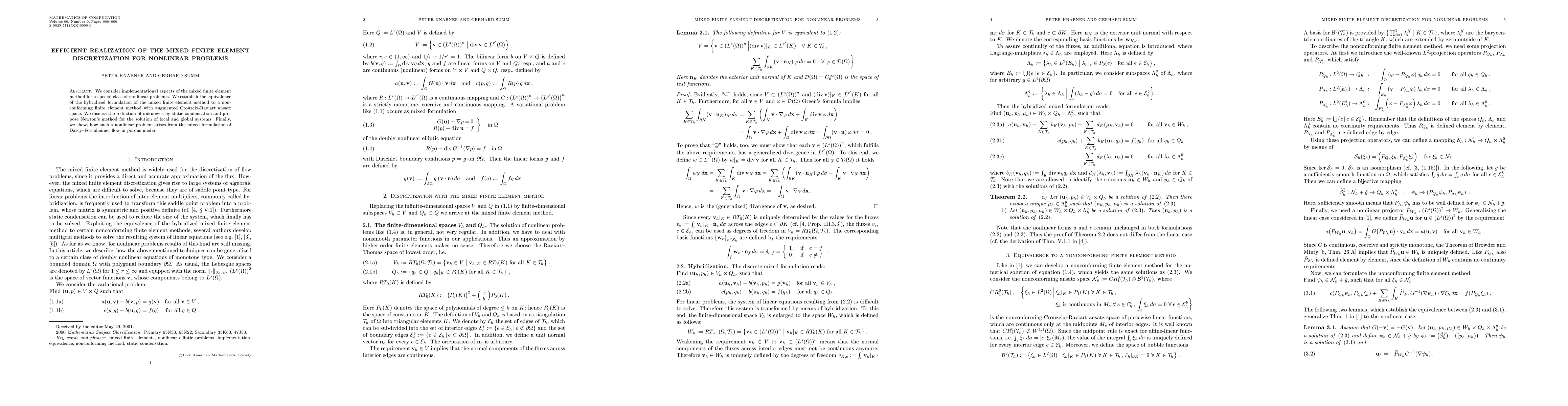 This paper explores efficient mixed finite element discretization for nonlinear problems, establishing equivalence to a nonconforming method and using static condensation to reduce unknowns. The study proposes Newton's method for solving systems and demonstrates its application to Darcy-Forchheimer flow in porous media.