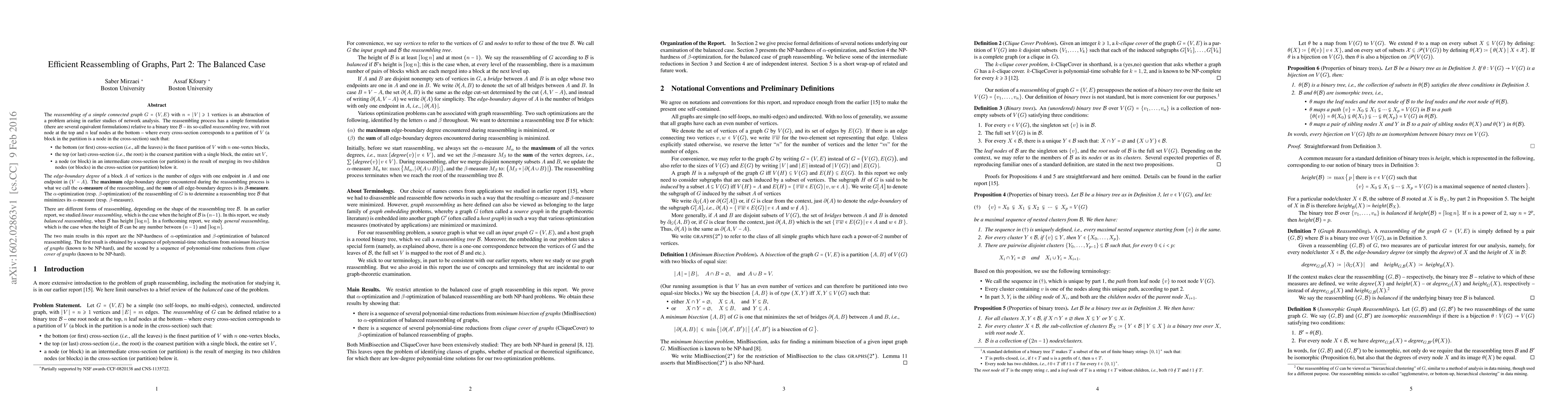The reassembling of a simple connected graph G = (V,E) is an abstraction of a problem arising in earlier studies of network analysis. The reassembling process has a simple formulation (there are several equivalent formulations) relative to a binary tree B (reassembling tree), with root node at the top and $n$ leaf nodes at the bottom, where every cross-section corresponds to a partition of V such that: - the bottom (or first) cross-section (all the leaves) is the finest partition of V with n one-vertex blocks, - the top (or last) cross-section (the root) is the coarsest partition with a single block, the entire set V, - a node (or block) in an intermediate cross-section (or partition) is the result of merging its two children nodes (or blocks) in the cross-section (or partition) below it. The maximum edge-boundary degree encountered during the reassembling process is what we call the alpha-measure of the reassembling, and the sum of all edge-boundary degrees is its beta-measure. The alpha-optimization (resp. beta-optimization) of the reassembling of G is to determine a reassembling tree B that minimizes its alpha-measure (resp. beta-measure). There are different forms of reassembling. In an earlier report, we studied linear reassembling, which is the case when the height of B is (n-1). In this report, we study balanced reassembling, when B has height [log n]. The two main results in this report are the NP-hardness of alpha-optimization and beta-optimization of balanced reassembling. The first result is obtained by a sequence of polynomial-time reductions from minimum bisection of graphs (known to be NP-hard), and the second by a sequence of polynomial-time reductions from clique cover of graphs (known to be NP-hard).