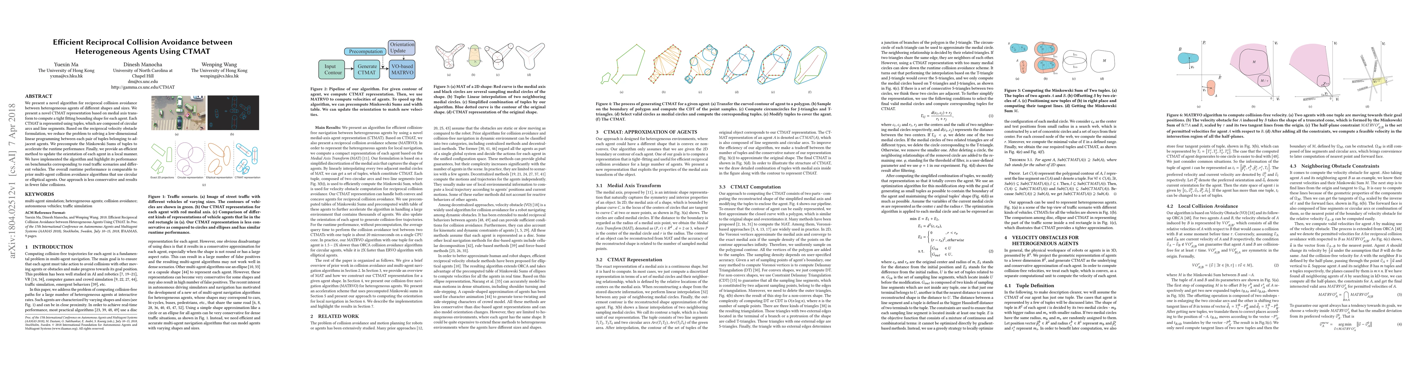 This paper introduces a novel CTMAT-based algorithm for efficient reciprocal collision avoidance among heterogeneous agents. It leverages a medial axis transform and precomputed Minkowski Sums for performance optimization, resulting in fewer false collisions compared to prior methods.