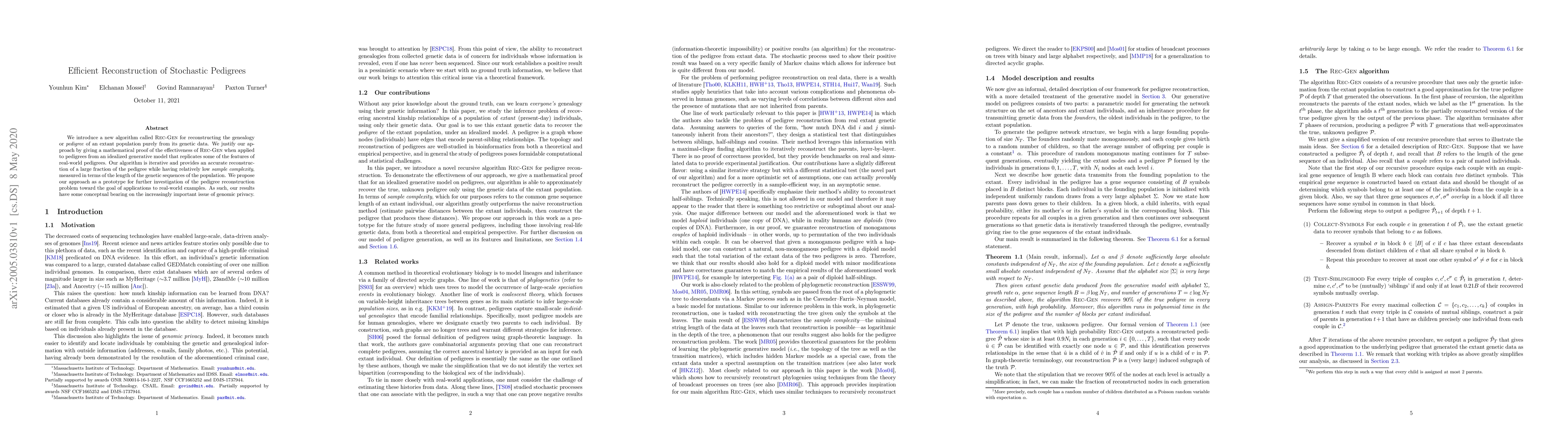 This paper presents the {\sc Rec-Gen} algorithm for reconstructing genealogies from genetic data, proving its effectiveness on idealized models. The iterative algorithm achieves accurate reconstruction with low sample complexity, positioning it as a prototype for real-world genomic privacy applications.