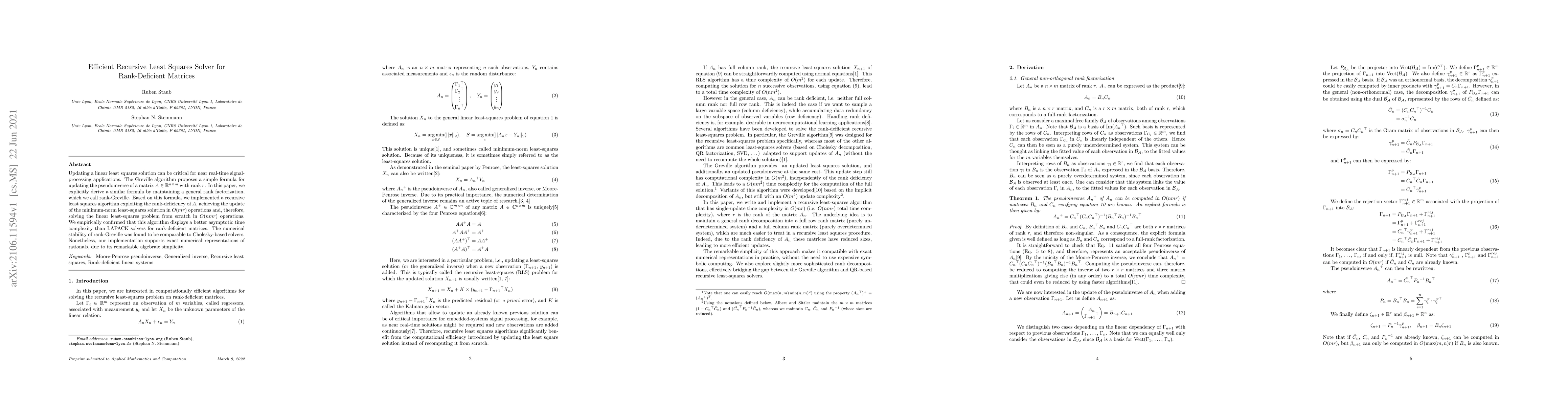This paper presents a recursive least squares solver that leverages the rank-deficiency of matrices, achieving updates in O(mr) operations and solving the linear least-squares problem from scratch in O(nmr) operations, outperforming LAPACK solvers for rank-deficient matrices while maintaining comparable numerical stability.