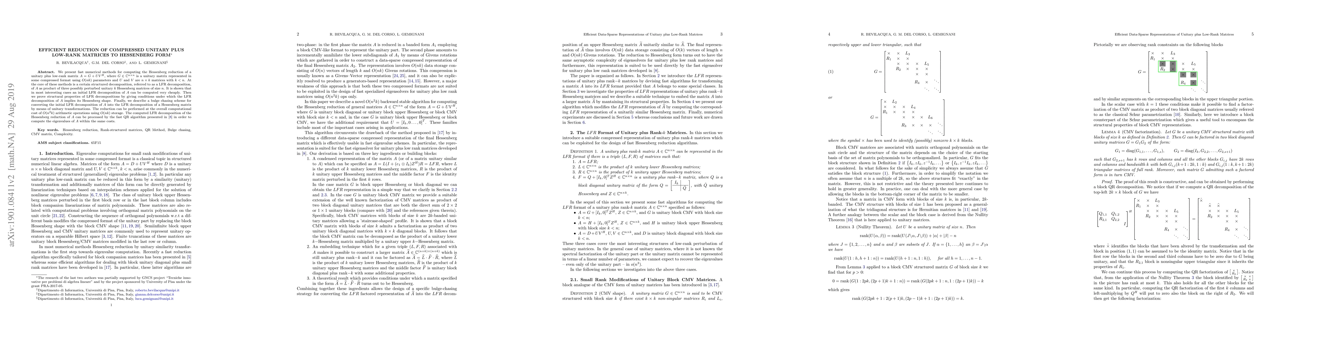 This paper presents efficient numerical methods for reducing a compressed unitary plus low-rank matrix to Hessenberg form, leveraging a structured LFR decomposition. The methods achieve a computational cost of $O(n^2 k)$ with $O(nk)$ storage, and the resulting Hessenberg form can be further processed to compute eigenvalues.