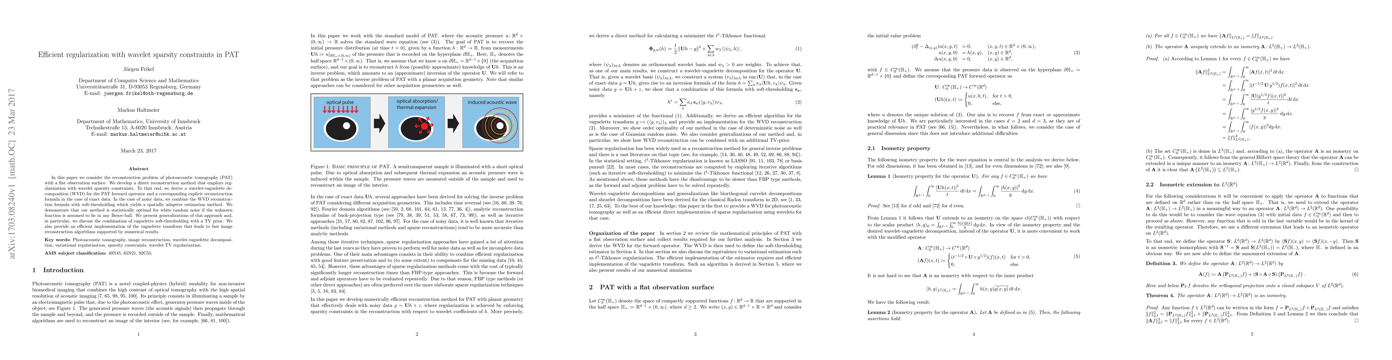 In this paper we consider the reconstruction problem of photoacoustic tomography (PAT) with a flat observation surface. We develop a direct reconstruction method that employs regularization with wavelet sparsity constraints. To that end, we derive a wavelet-vaguelette decomposition (WVD) for the PAT forward operator and a corresponding explicit reconstruction formula in the case of exact data. In the case of noisy data, we combine the WVD reconstruction formula with soft-thresholding which yields a spatially adaptive estimation method. We demonstrate that our method is statistically optimal for white random noise if the unknown function is assumed to lie in any Besov-ball. We present generalizations of this approach and, in particular, we discuss the combination of vaguelette soft-thresholding with a TV prior. We also provide an efficient implementation of the vaguelette transform that leads to fast image reconstruction algorithms supported by numerical results.
