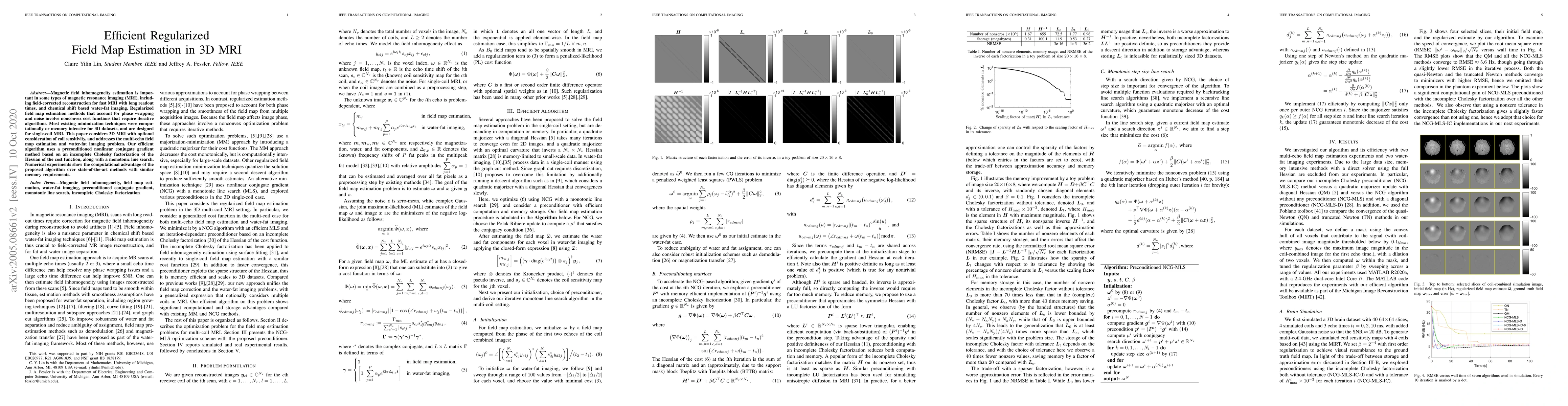 This paper proposes an efficient algorithm for estimating 3D MRI field maps using a preconditioned nonlinear conjugate gradient method, which addresses phase wrapping and noise issues. The method demonstrates computational advantages over existing techniques, particularly for multi-echo field map estimation and water-fat imaging.