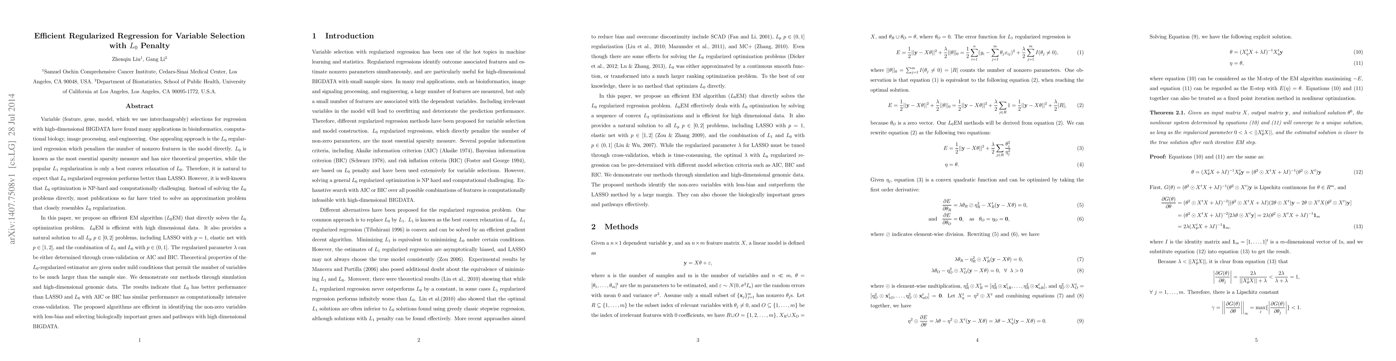 This paper proposes an efficient EM algorithm (L0EM) to solve the L0 optimization problem for regularized regression, which directly penalizes the number of nonzero features. The L0EM algorithm is shown to be effective for high-dimensional data and outperforms LASSO in simulations, demonstrating better performance in variable selection with high-dimensional genomic data.