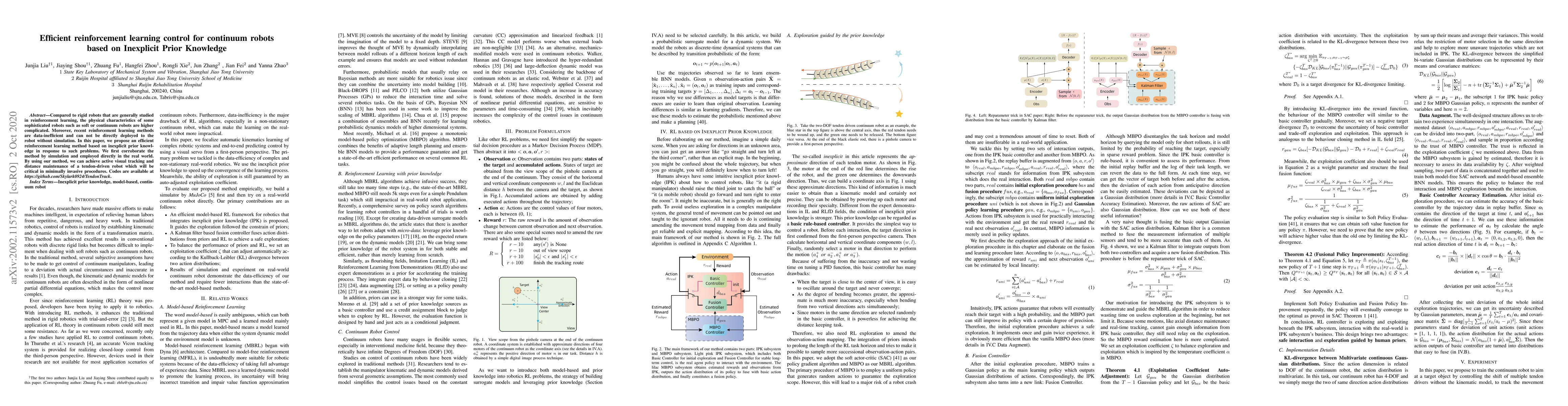 This paper proposes an efficient reinforcement learning method leveraging inexplicit prior knowledge for controlling continuum robots, addressing data inefficiency and simulation-to-real deployment issues. The method is validated through simulation and successfully applied to real-world tendon-driven robots for tasks like active visual tracking and distance maintenance, crucial for minimally invasive procedures.