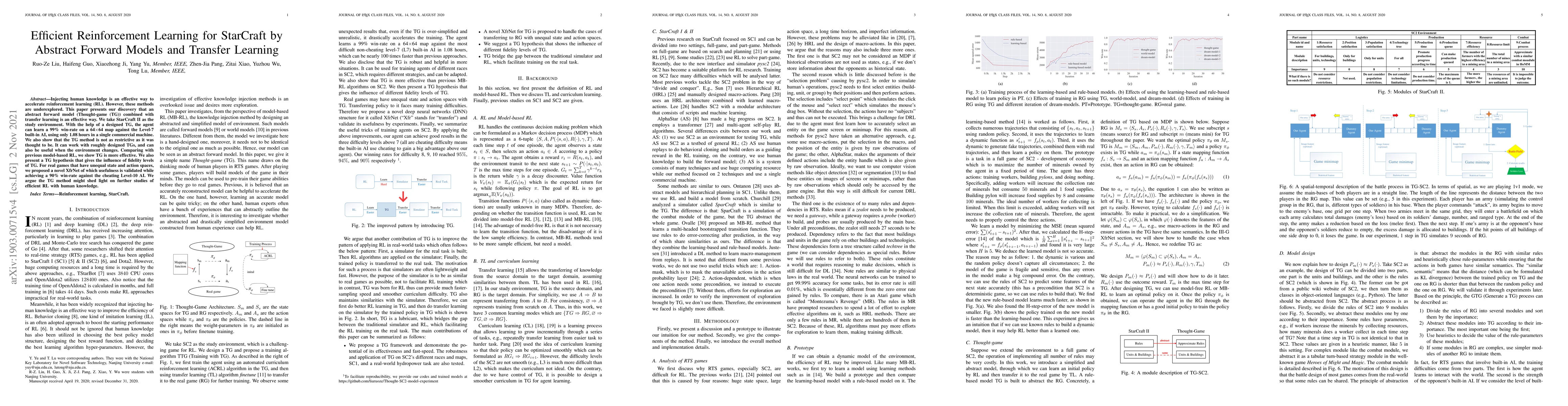 Injecting human knowledge is an effective way to accelerate reinforcement learning (RL). However, these methods are underexplored. This paper presents our discovery that an abstract forward model (thought-game (TG)) combined with transfer learning (TL) is an effective way. We take StarCraft II as our study environment. With the help of a designed TG, the agent can learn a 99% win-rate on a 64x64 map against the Level-7 built-in AI, using only 1.08 hours in a single commercial machine. We also show that the TG method is not as restrictive as it was thought to be. It can work with roughly designed TGs, and can also be useful when the environment changes. Comparing with previous model-based RL, we show TG is more effective. We also present a TG hypothesis that gives the influence of different fidelity levels of TG. For real games that have unequal state and action spaces, we proposed a novel XfrNet of which usefulness is validated while achieving a 90% win-rate against the cheating Level-10 AI. We argue that the TG method might shed light on further studies of efficient RL with human knowledge.