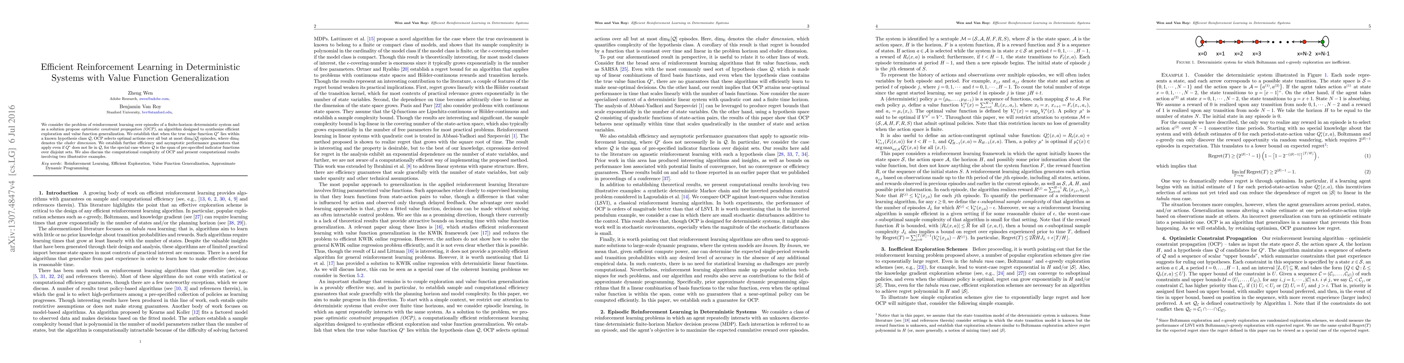 This paper proposes an optimistic constraint propagation (OCP) algorithm for efficient reinforcement learning in deterministic systems, ensuring optimal action selection in most episodes. It provides theoretical guarantees for value function generalization and discusses computational complexity, supported by illustrative examples.
