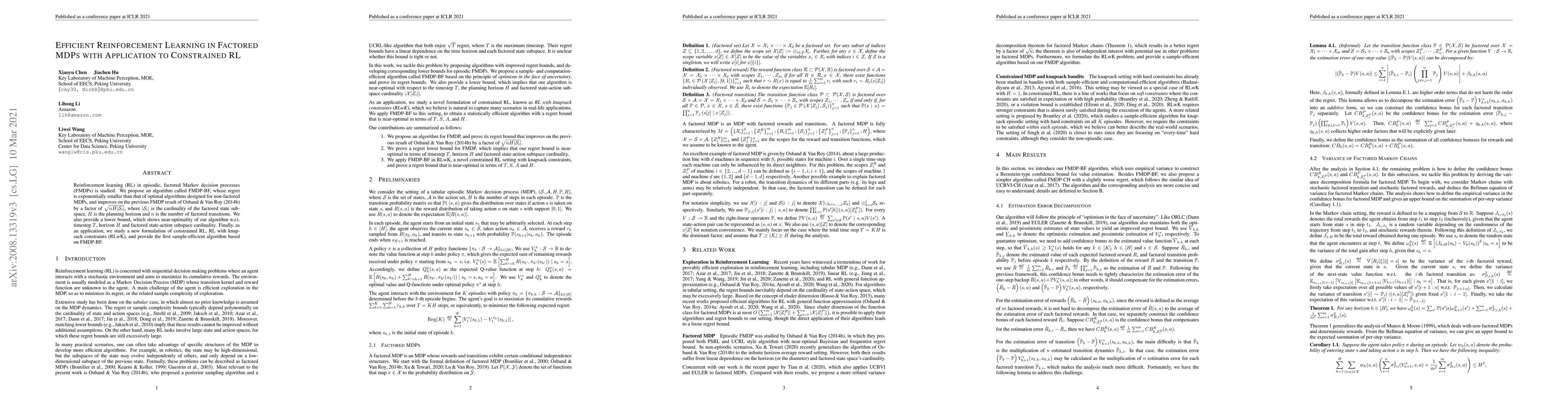 This paper proposes FMDP-BF, an efficient reinforcement learning algorithm for factored Markov decision processes (FMDPs), demonstrating exponentially smaller regret compared to non-factored MDP algorithms. The authors also establish a near-optimality lower bound and apply the algorithm to develop the first sample-efficient method for constrained reinforcement learning with knapsack constraints.