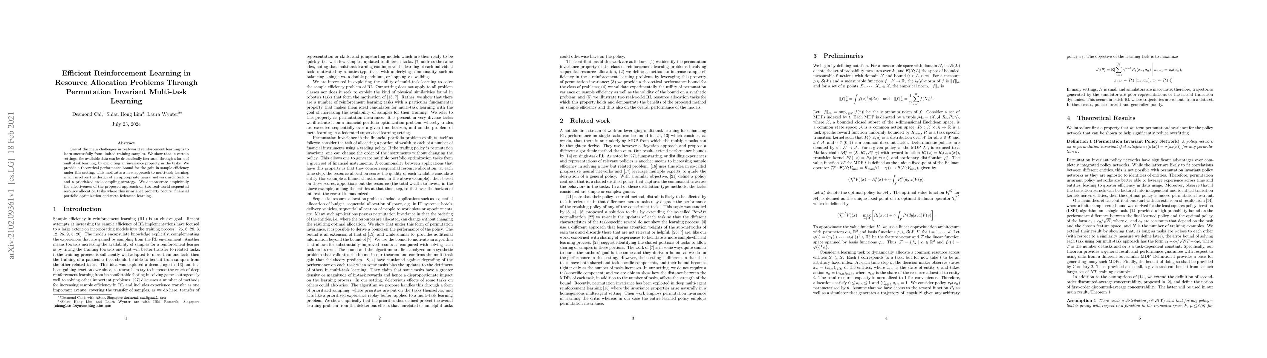 This paper proposes a permutation invariant multi-task learning approach to enhance reinforcement learning's sample efficiency, leveraging task invariance properties. The method is theoretically justified and empirically validated on financial portfolio optimization and meta federated learning.
