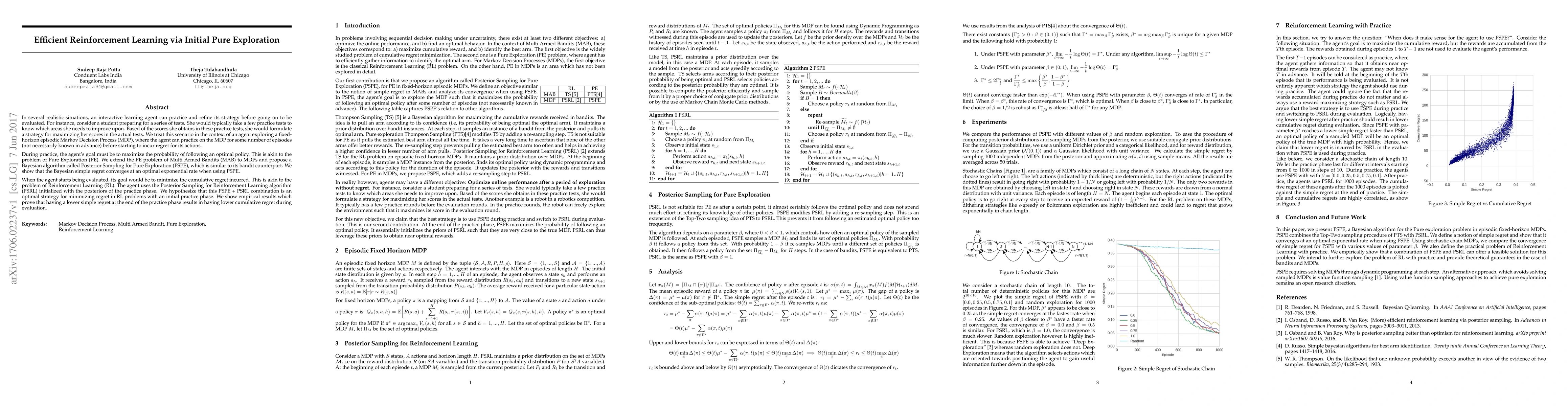 A new algorithm called Posterior Sampling for Pure Exploration (PSPE) is proposed to efficiently learn a policy in an MDP during an initial practice phase, followed by a Reinforcement Learning approach, PSRL, to minimize cumulative regret during evaluation. The study shows that combining these two approaches results in lower cumulative regret compared to other strategies.