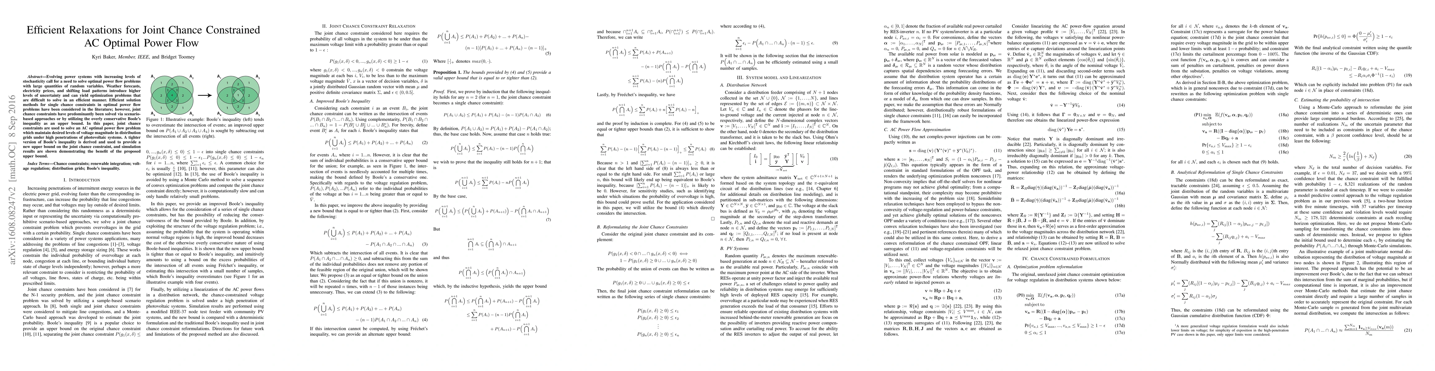 Evolving power systems with increasing levels of stochasticity call for a need to solve optimal power flow problems with large quantities of random variables. Weather forecasts, electricity prices, and shifting load patterns introduce higher levels of uncertainty and can yield optimization problems that are difficult to solve in an efficient manner. Efficient solution methods for single chance constraints in optimal power flow problems have been considered in the literature; however, joint chance constraints have predominantly been solved via scenario-based approaches or by utilizing the overly conservative Boole's inequality as an upper bound. In this paper, joint chance constraints are used to solve an AC optimal power flow problem which maintain desired levels of voltage magnitude in distribution grids under high penetrations of photovoltaic systems. A tighter version of Boole's inequality is derived and used to provide a new upper bound on the joint chance constraint, and simulation results are shown demonstrating the benefit of the proposed upper bound.