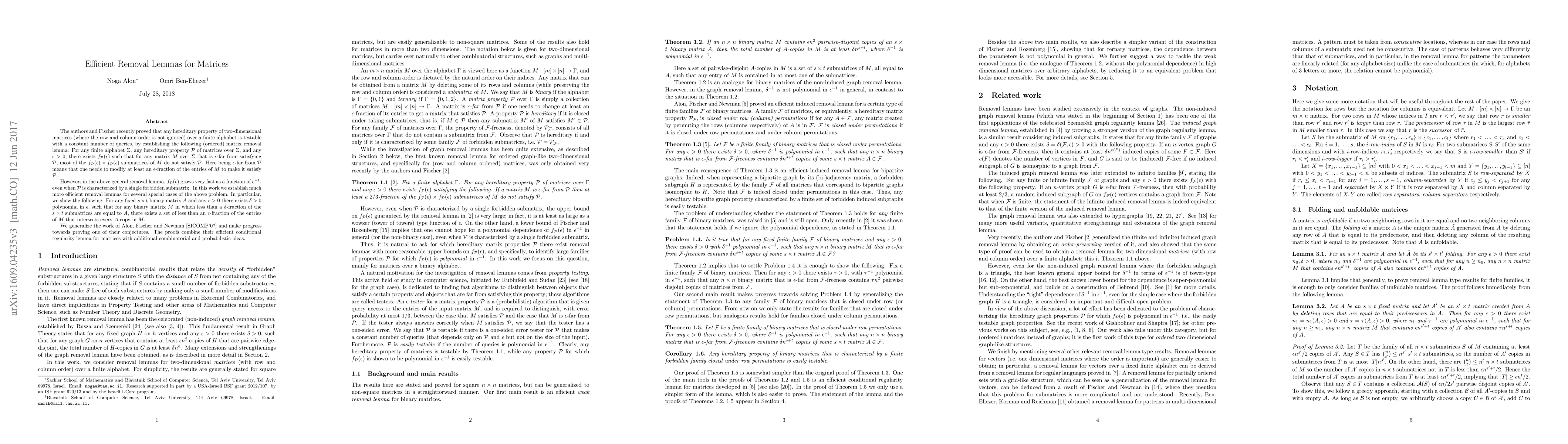 This paper establishes more efficient removal lemmas for specific hereditary properties of binary matrices, improving upon general results by showing that for any fixed binary matrix $A$, a small fraction of $A$-copies can be removed by modifying a polynomially smaller fraction of entries. The work builds on and extends previous results by Alon, Fischer, and Newman.