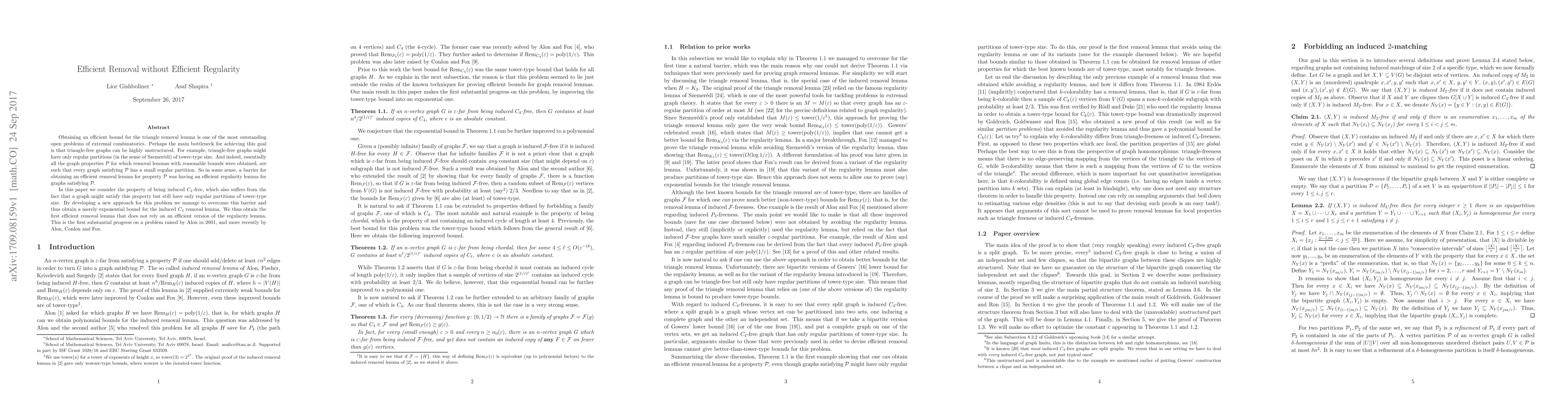 Obtaining an efficient bound for the triangle removal lemma is one of the most outstanding open problems of extremal combinatorics. Perhaps the main bottleneck for achieving this goal is that triangle-free graphs can be highly unstructured. For example, triangle-free graphs might have only regular partitions (in the sense of Szemer\'edi) of tower-type size. And indeed, essentially all the graph properties ${\cal P}$ for which removal lemmas with reasonable bounds were obtained, are such that every graph satisfying ${\cal P}$ has a small regular partition. So in some sense, a barrier for obtaining an efficient removal lemma for property ${\cal P}$ was having an efficient regularity lemma for graphs satisfying ${\cal P}$. In this paper we consider the property of being induced $C_4$-free, which also suffers from the fact that a graph might satisfy this property but still have only regular partitions of tower-type size. By developing a new approach for this problem we manage to overcome this barrier and thus obtain a merely exponential bound for the induced $C_4$ removal lemma. We thus obtain the first efficient removal lemma that does not rely on an efficient version of the regularity lemma. This is the first substantial progress on a problem raised by Alon in 2001, and more recently by Alon, Conlon and Fox.