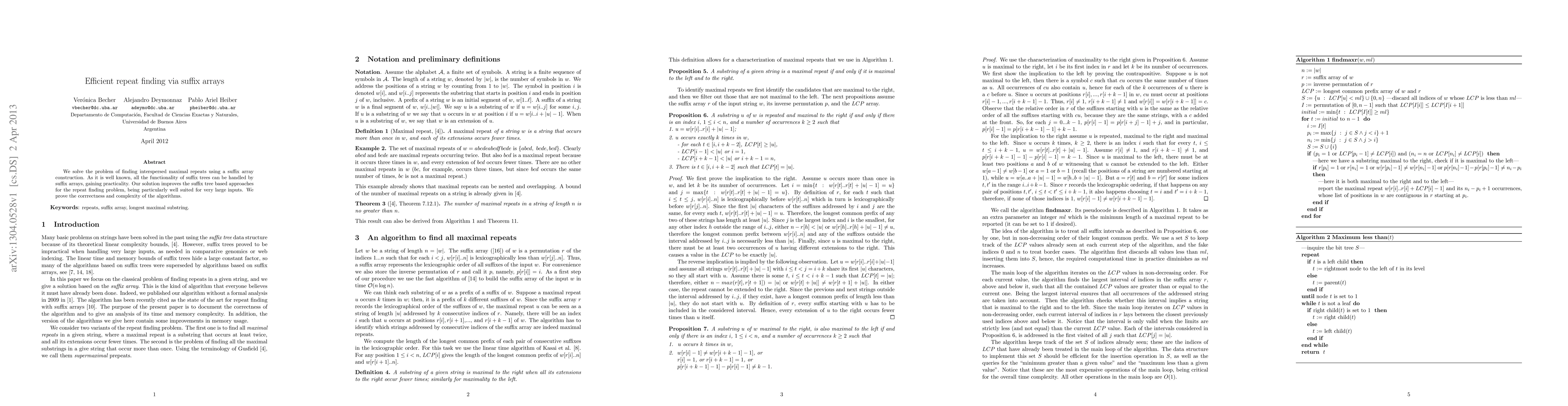 The paper presents an efficient algorithm for finding maximal repeats using suffix arrays, along with an improved memory-efficient implementation and proofs of correctness and complexity.
