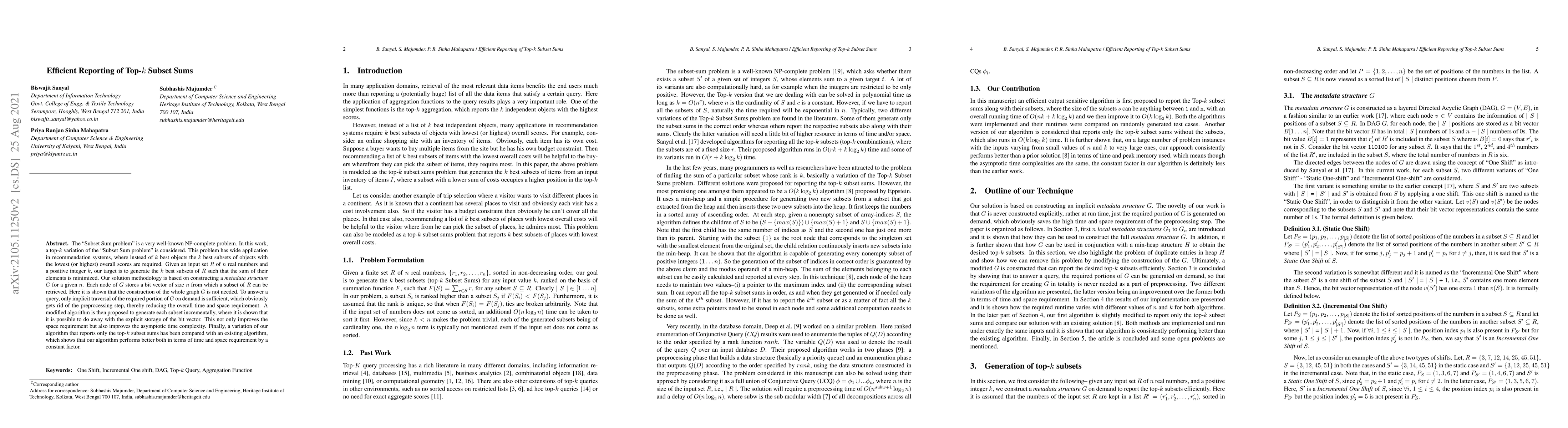 The "Subset Sum problem" is a very well-known NP-complete problem. In this work, a top-k variation of the "Subset Sum problem" is considered. This problem has wide application in recommendation systems, where instead of k best objects the k best subsets of objects with the lowest (or highest) overall scores are required. Given an input set R of n real numbers and a positive integer k, our target is to generate the k best subsets of R such that the sum of their elements is minimized. Our solution methodology is based on constructing a metadata structure G for a given n. Each node of G stores a bit vector of size n from which a subset of R can be retrieved. Here it is shown that the construction of the whole graph G is not needed. To answer a query, only implicit traversal of the required portion of G on demand is sufficient, which obviously gets rid of the preprocessing step, thereby reducing the overall time and space requirement. A modified algorithm is then proposed to generate each subset incrementally, where it is shown that it is possible to do away with the explicit storage of the bit vector. This not only improves the space requirement but also improves the asymptotic time complexity. Finally, a variation of our algorithm that reports only the top-k subset sums has been compared with an existing algorithm, which shows that our algorithm performs better both in terms of time and space requirement by a constant factor.