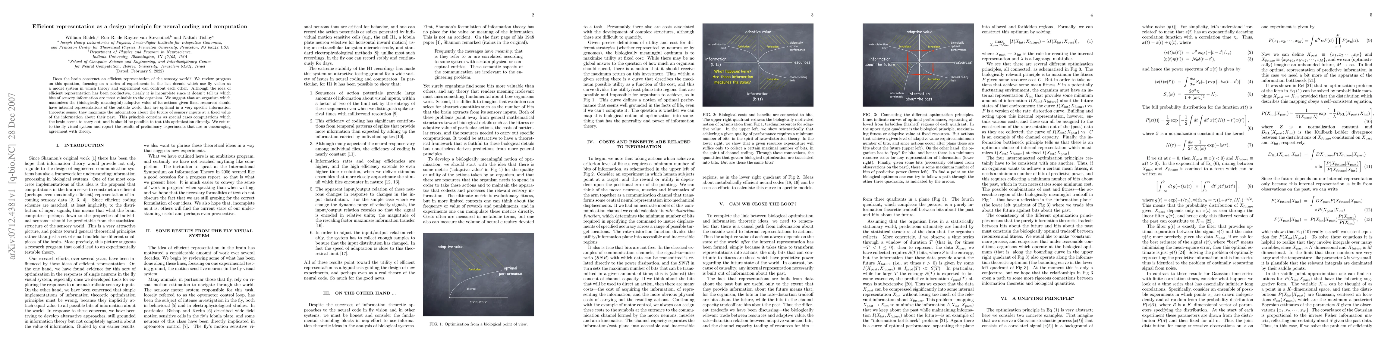 Does the brain construct an efficient representation of the sensory world? We review progress on this question, focusing on a series of experiments in the last decade which use fly vision as a model system in which theory and experiment can confront each other. Although the idea of efficient representation has been productive, clearly it is incomplete since it doesn't tell us which bits of sensory information are most valuable to the organism. We suggest that an organism which maximizes the (biologically meaningful) adaptive value of its actions given fixed resources should have internal representations of the outside world that are optimal in a very specific information theoretic sense: they maximize the information about the future of sensory inputs at a fixed value of the information about their past. This principle contains as special cases computations which the brain seems to carry out, and it should be possible to test this optimization directly. We return to the fly visual system and report the results of preliminary experiments that are in encouraging agreement with theory.
