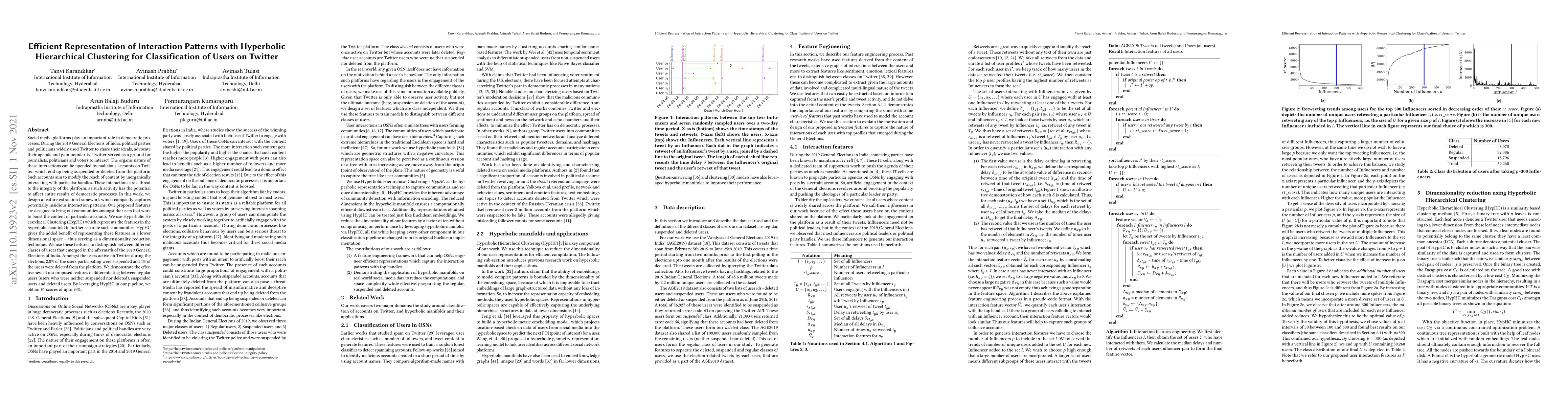 Social media platforms play an important role in democratic processes. During the 2019 General Elections of India, political parties and politicians widely used Twitter to share their ideals, advocate their agenda and gain popularity. Twitter served as a ground for journalists, politicians and voters to interact. The organic nature of these interactions can be upended by malicious accounts on Twitter, which end up being suspended or deleted from the platform. Such accounts aim to modify the reach of content by inorganically interacting with particular handles. These interactions are a threat to the integrity of the platform, as such activity has the potential to affect entire results of democratic processes. In this work, we design a feature extraction framework which compactly captures potentially insidious interaction patterns. Our proposed features are designed to bring out communities amongst the users that work to boost the content of particular accounts. We use Hyperbolic Hierarchical Clustering (HypHC) which represents the features in the hyperbolic manifold to further separate such communities. HypHC gives the added benefit of representing these features in a lower dimensional space -- thus serving as a dimensionality reduction technique. We use these features to distinguish between different classes of users that emerged in the aftermath of the 2019 General Elections of India. Amongst the users active on Twitter during the elections, 2.8% of the users participating were suspended and 1% of the users were deleted from the platform. We demonstrate the effectiveness of our proposed features in differentiating between regular users (users who were neither suspended nor deleted), suspended users and deleted users. By leveraging HypHC in our pipeline, we obtain F1 scores of upto 93%.