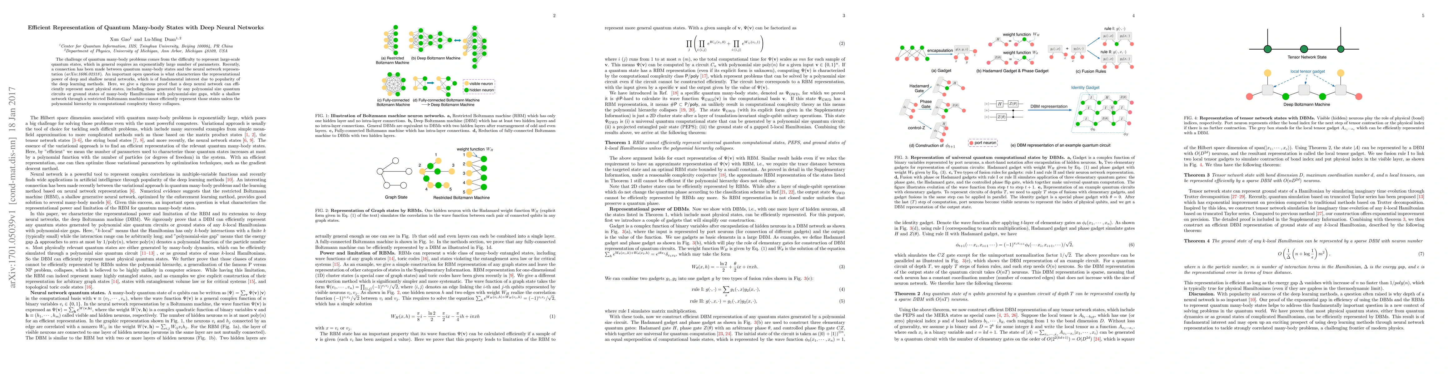 The paper presents a rigorous proof that deep neural networks can efficiently represent most physical quantum states, including those generated by polynomial-size quantum circuits or ground states of many-body Hamiltonians with polynomial-size gaps. It contrasts this with shallow networks, like restricted Boltzmann machines, which cannot efficiently represent such states unless the polynomial hierarchy collapses.