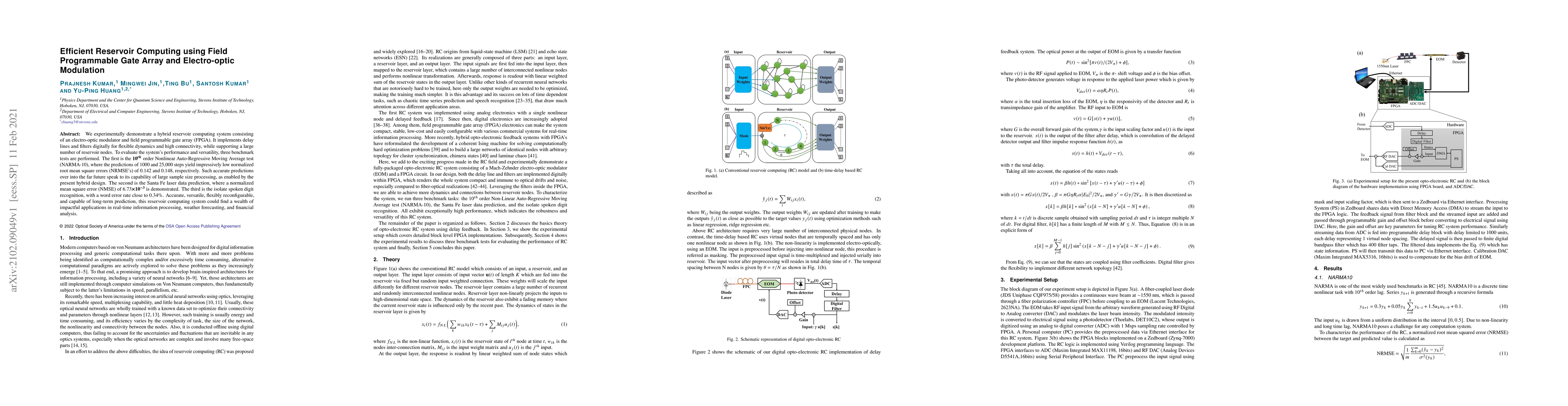This research demonstrates a hybrid reservoir computing system combining an electro-optic modulator with an FPGA, achieving high connectivity and flexible dynamics. Benchmark tests show impressive performance in NARMA-10, Santa Fe laser data prediction, and spoken digit recognition, indicating its potential for real-time information processing and forecasting.