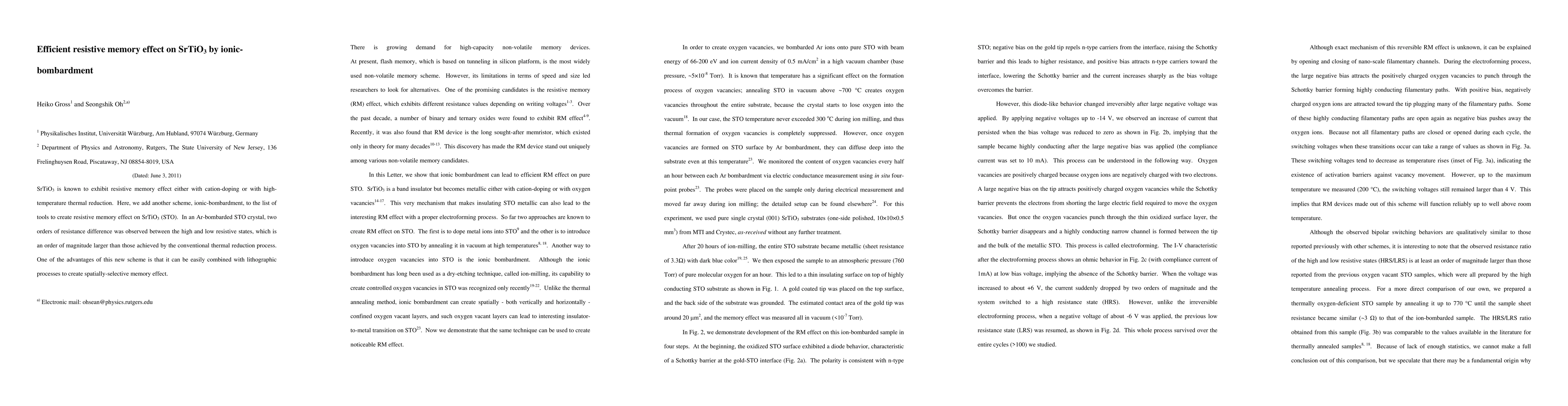 Researchers successfully created a resistive memory effect on SrTiO3 using ionic-bombardment, achieving an order of magnitude larger resistance difference than traditional thermal reduction methods.