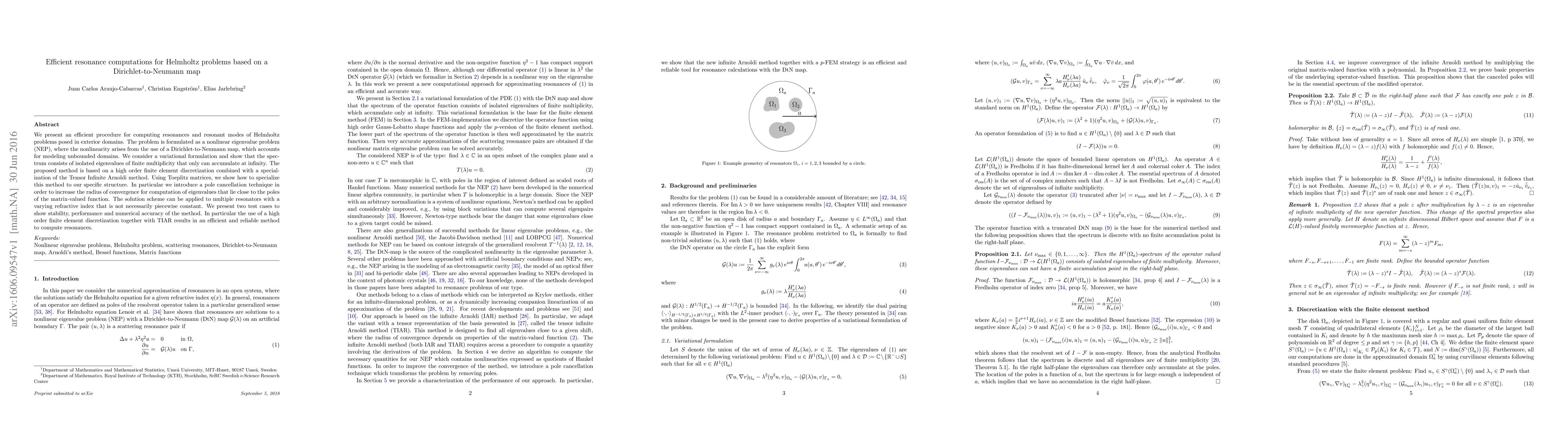 This paper proposes an efficient method for computing resonances in Helmholtz problems using a Dirichlet-to-Neumann map, formulated as a nonlinear eigenvalue problem. The method combines high-order finite elements with a specialized Tensor Infinite Arnoldi method and demonstrates stability, performance, and accuracy through test cases.
