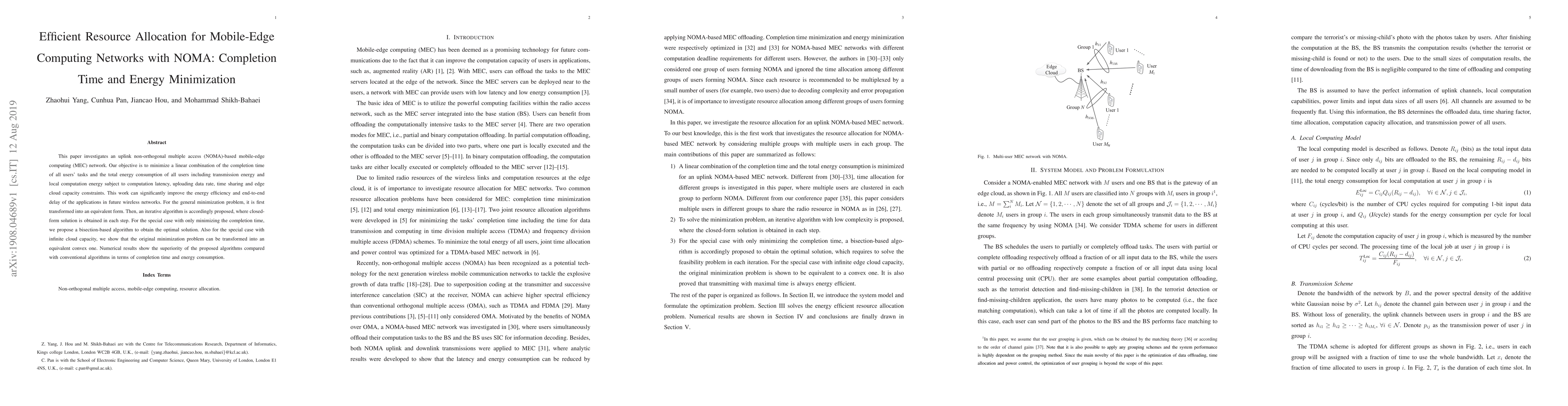 This paper proposes efficient algorithms for resource allocation in mobile-edge computing networks using non-orthogonal multiple access to minimize completion time and energy consumption.
