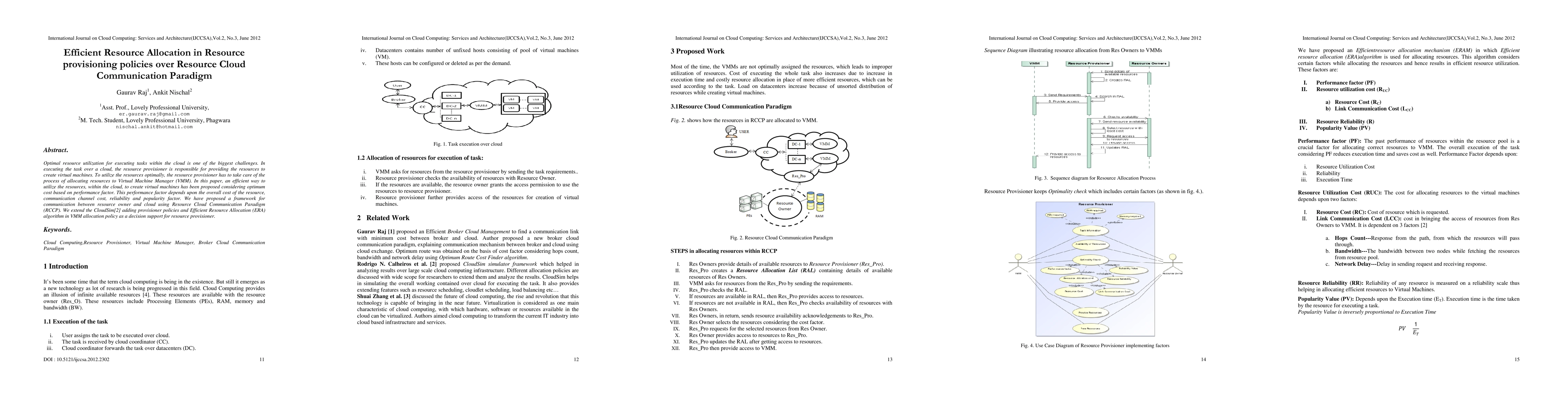 This paper proposes an efficient resource allocation framework within the cloud, focusing on optimal resource utilization to create virtual machines. The proposed Resource Cloud Communication Paradigm (RCCP) framework enhances CloudSim by incorporating provisioner policies and an Efficient Resource Allocation (ERA) algorithm to balance cost, communication, reliability, and popularity factors.