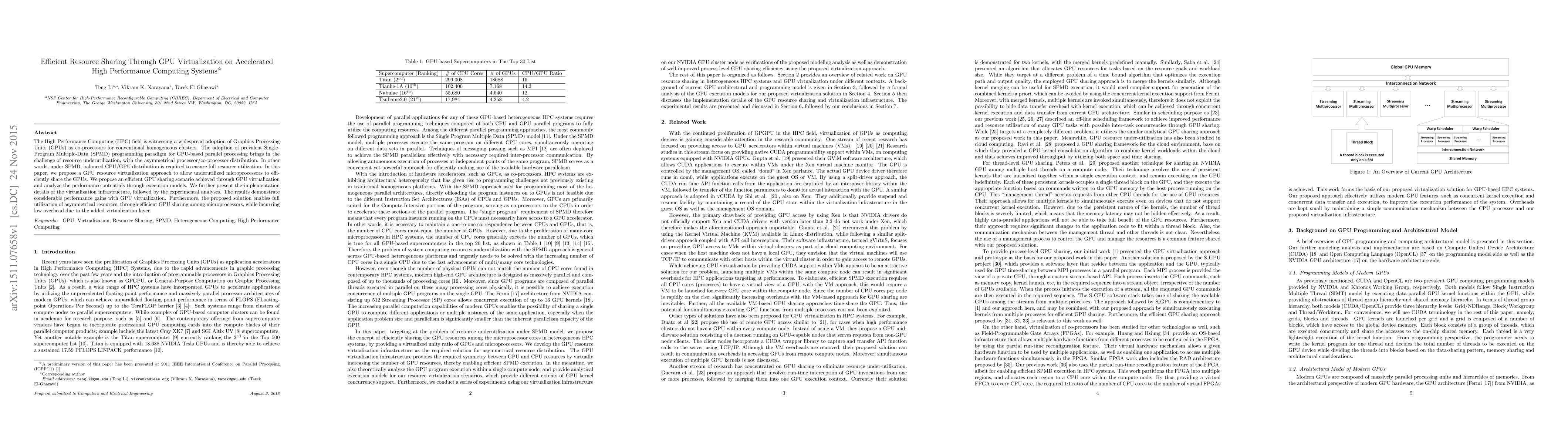 This paper proposes a GPU virtualization approach to efficiently share underutilized GPUs among microprocessors in HPC systems, addressing resource underutilization in SPMD programming. Experimental results show significant performance gains and full resource utilization with minimal overhead from the virtualization layer.