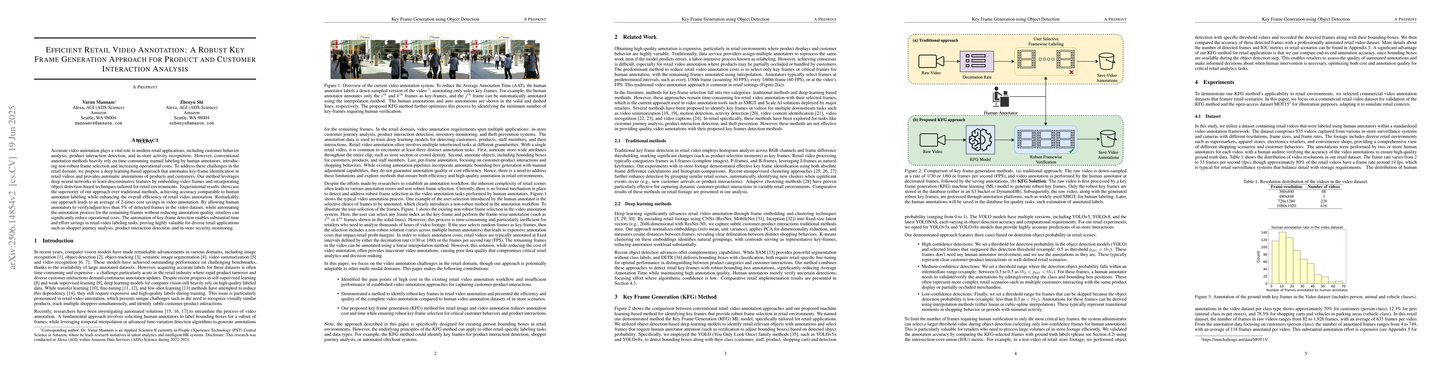 Accurate video annotation plays a vital role in modern retail applications, including customer behavior analysis, product interaction detection, and in-store activity recognition. However, conventional annotation methods heavily rely on time-consuming manual labeling by human annotators, introducing non-robust frame selection and increasing operational costs. To address these challenges in the retail domain, we propose a deep learning-based approach that automates key-frame identification in retail videos and provides automatic annotations of products and customers. Our method leverages deep neural networks to learn discriminative features by embedding video frames and incorporating object detection-based techniques tailored for retail environments. Experimental results showcase the superiority of our approach over traditional methods, achieving accuracy comparable to human annotator labeling while enhancing the overall efficiency of retail video annotation. Remarkably, our approach leads to an average of 2 times cost savings in video annotation. By allowing human annotators to verify/adjust less than 5% of detected frames in the video dataset, while automating the annotation process for the remaining frames without reducing annotation quality, retailers can significantly reduce operational costs. The automation of key-frame detection enables substantial time and effort savings in retail video labeling tasks, proving highly valuable for diverse retail applications such as shopper journey analysis, product interaction detection, and in-store security monitoring.