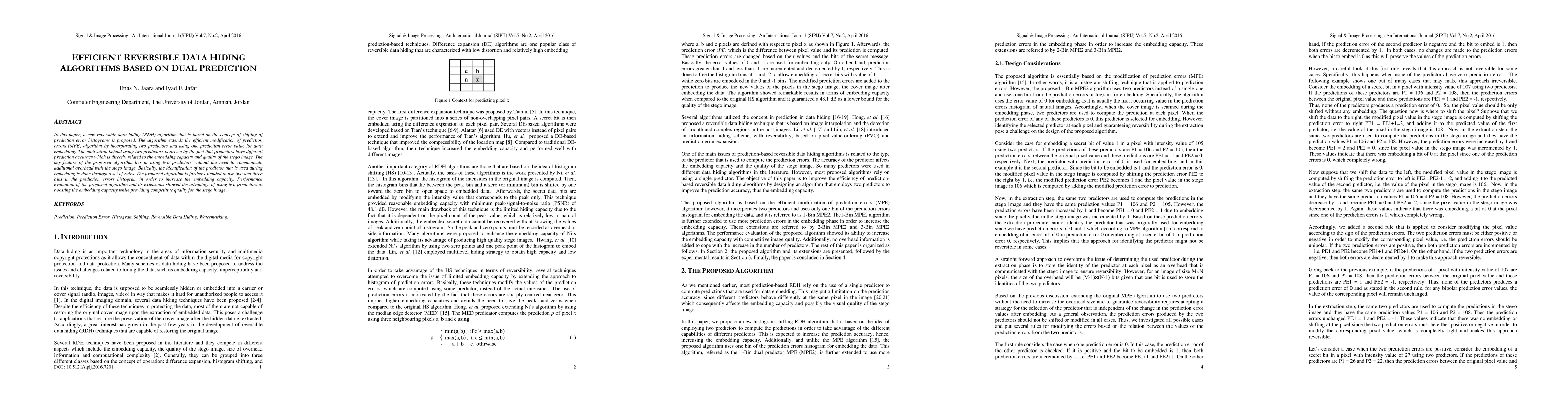 This paper proposes a new reversible data hiding algorithm that utilizes dual prediction to enhance embedding capacity and image quality. By employing two predictors with different prediction accuracies, the algorithm achieves higher embedding efficiency without requiring additional communication overhead, demonstrating improved performance in capacity and stego image quality.