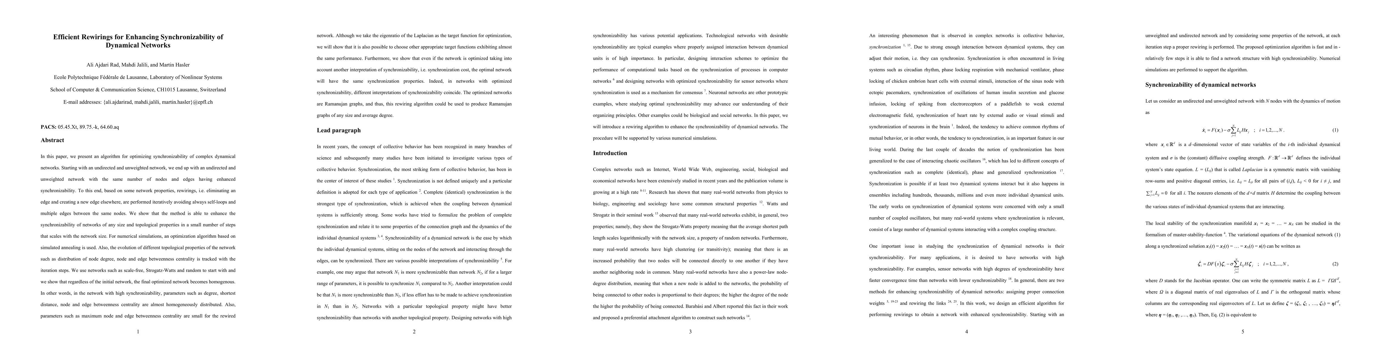 This paper proposes an algorithm to enhance the synchronizability of complex dynamical networks through iterative rewirings, optimizing the eigenratio of the Laplacian. The method efficiently produces Ramanujan graphs, scaling well with network size and applicable to networks of any topological properties.