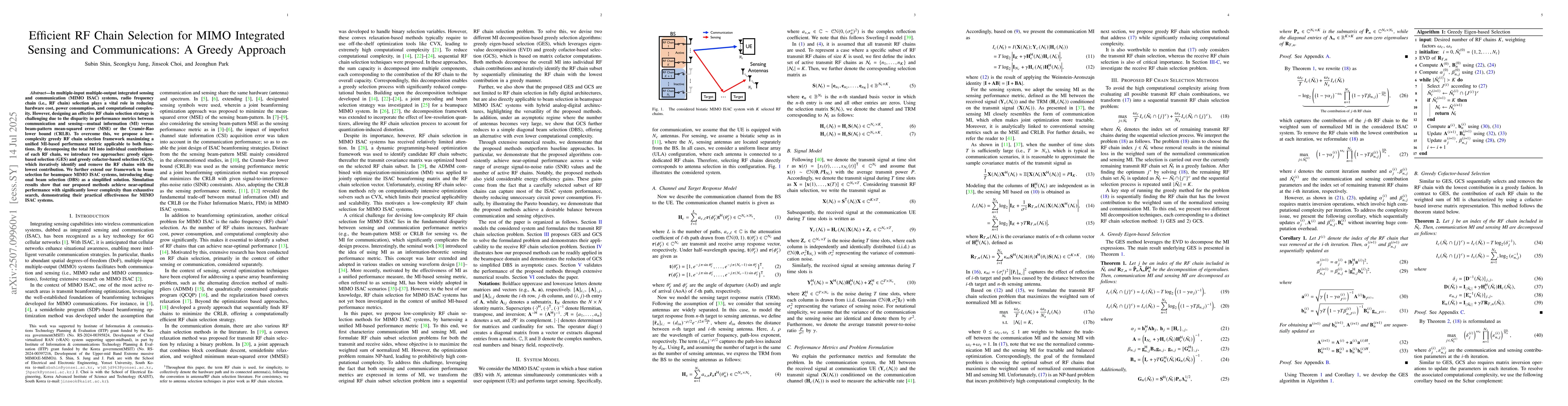 In multiple-input multiple-output integrated sensing and communication (MIMO ISAC) systems, radio frequency chain (i.e., RF chain) selection plays a vital role in reducing hardware cost, power consumption, and computational complexity. However, designing an effective RF chain selection strategy is challenging due to the disparity in performance metrics between communication and sensing-mutual information (MI) versus beam-pattern mean-squared error (MSE) or the Cram\'er-Rao lower bound (CRLB). To overcome this, we propose a low-complexity greedy RF chain selection framework maximizing a unified MI-based performance metric applicable to both functions. By decomposing the total MI into individual contributions of each RF chain, we introduce two approaches: greedy eigen-based selection (GES) and greedy cofactor-based selection (GCS), which iteratively identify and remove the RF chains with the lowest contribution. We further extend our framework to beam selection for beamspace MIMO ISAC systems, introducing diagonal beam selection (DBS) as a simplified solution. Simulation results show that our proposed methods achieve near-optimal performance with significantly lower complexity than exhaustive search, demonstrating their practical effectiveness for MIMO ISAC systems.