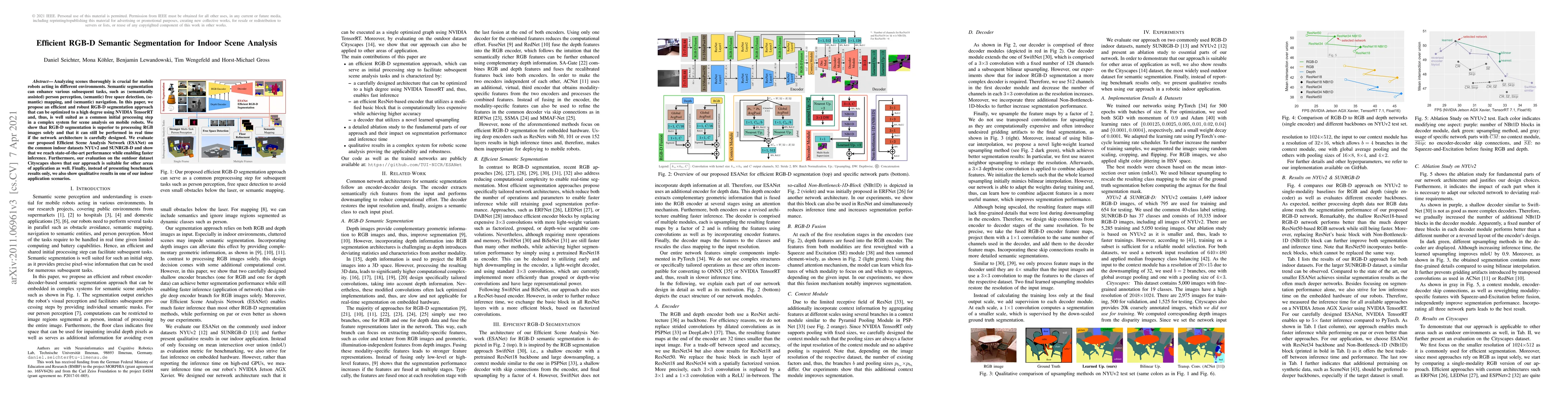 This paper proposes an efficient RGB-D semantic segmentation method optimized with NVIDIA TensorRT for real-time indoor scene analysis in mobile robots, achieving state-of-the-art performance on datasets like NYUv2 and SUNRGB-D. The approach demonstrates superior results over RGB-only processing and extends applicability to outdoor datasets like Cityscapes.