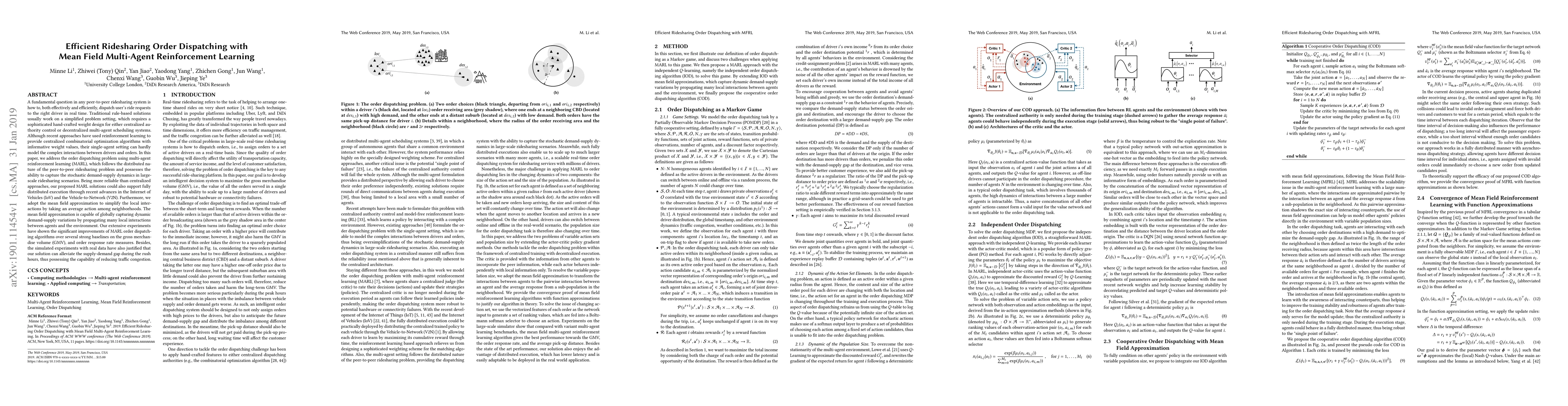 This paper proposes a multi-agent reinforcement learning (MARL) approach with mean field approximation for efficient ridesharing order dispatching, addressing the complex interactions between drivers and orders in large-scale systems. The method outperforms traditional and single-agent reinforcement learning baselines, significantly improving gross merchandise volume and order response rates, and reducing traffic congestion during peak hours.