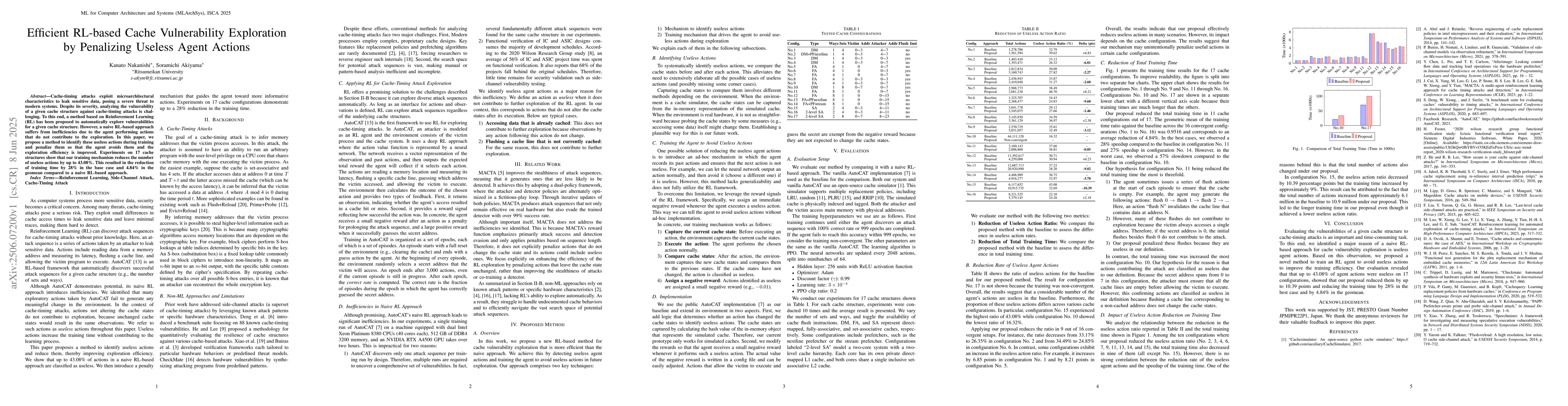 Cache-timing attacks exploit microarchitectural characteristics to leak sensitive data, posing a severe threat to modern systems. Despite its severity, analyzing the vulnerability of a given cache structure against cache-timing attacks is challenging. To this end, a method based on Reinforcement Learning (RL) has been proposed to automatically explore vulnerabilities for a given cache structure. However, a naive RL-based approach suffers from inefficiencies due to the agent performing actions that do not contribute to the exploration. In this paper, we propose a method to identify these useless actions during training and penalize them so that the agent avoids them and the exploration efficiency is improved. Experiments on 17 cache structures show that our training mechanism reduces the number of useless actions by up to 43.08%. This resulted in the reduction of training time by 28\% in the base case and 4.84\% in the geomean compared to a naive RL-based approach.