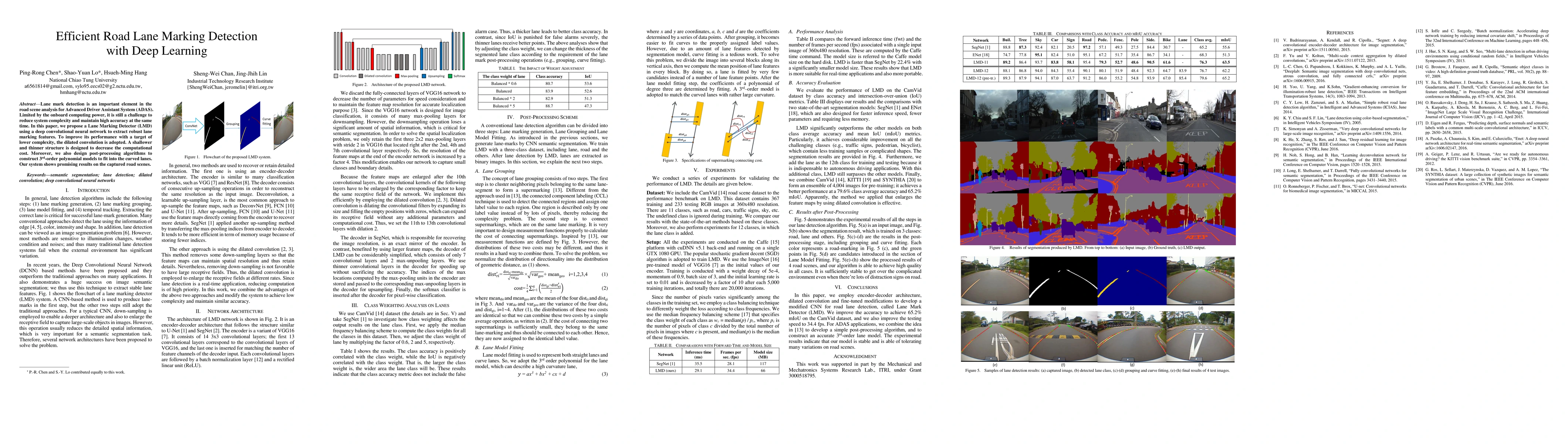 This paper proposes a deep convolutional neural network with dilated convolutions for efficient lane marking detection in ADAS, aiming to balance accuracy and reduced computational complexity. Post-processing algorithms fit 3rd-order polynomial models to curved lanes, demonstrating promising results in real-world road scenes.