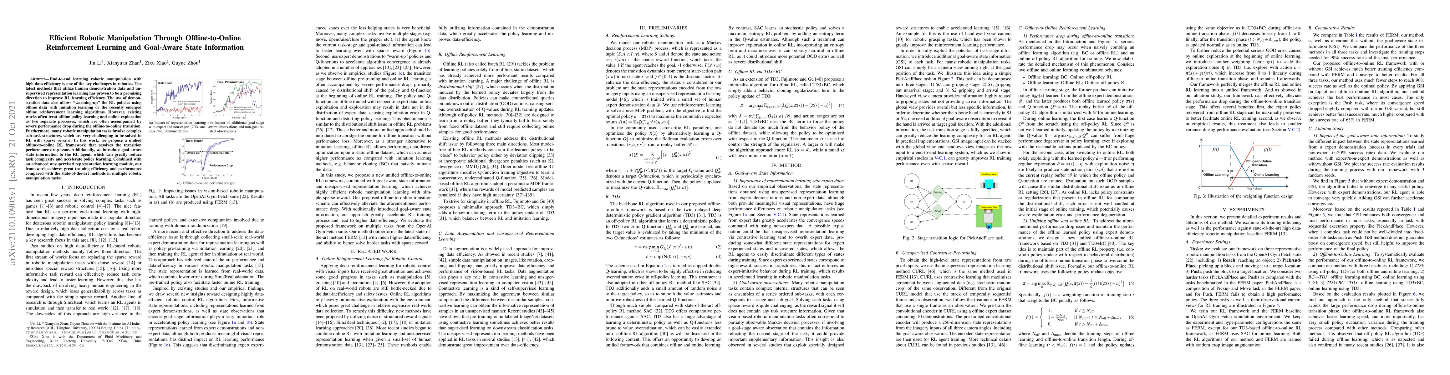 This paper proposes an efficient offline-to-online reinforcement learning framework for robotic manipulation, addressing performance drops during the transition from offline to online learning. It integrates goal-aware state information and advanced unsupervised representation learning to enhance training efficiency and task performance.